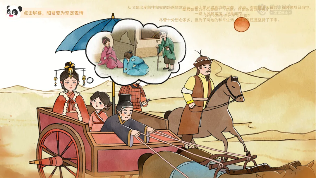 小结:从汉朝出发前往匈奴的路途非常遥远,路上要经过荒凉的戈壁、沙漠,有时候漫天黄沙,有时候烈日当空,一路上风餐露宿,很是辛苦。尽管十分想念家乡,但为了两地的和平生活,王昭君还是坚持了下来。