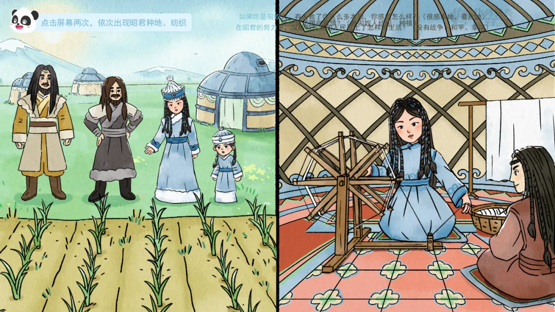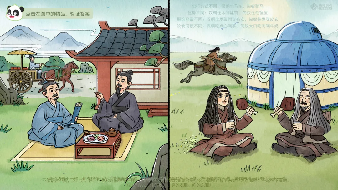 ——除了语言不一样,还有很多行为习惯也很不一样。左边是昭君在汉朝的生活场景,右边是匈奴人的。请你来找一找有什么不一样。