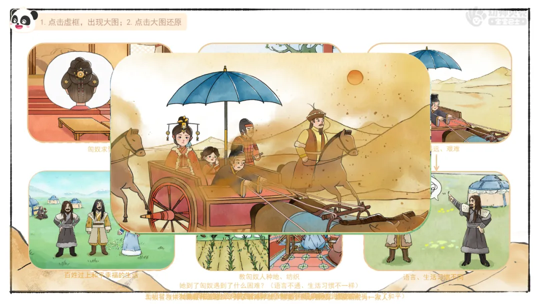 2.播放故事视频、出示组图,进一步感受昭君的毅力,并初步了解王昭君为宣传汉文化、促进两个民族之间的互相理解做出的贡献。