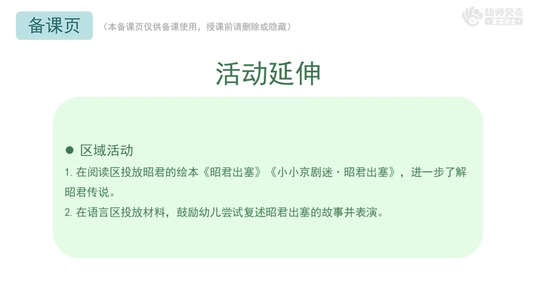 1.在阅读区投放昭君的绘本《昭君出塞》《小小京剧迷·昭君出塞》与传说故事(可打印出来装订)。