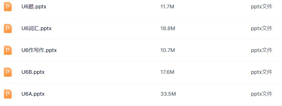 包括五个课件,涉及Section A,Section B,词汇,写作,语法。