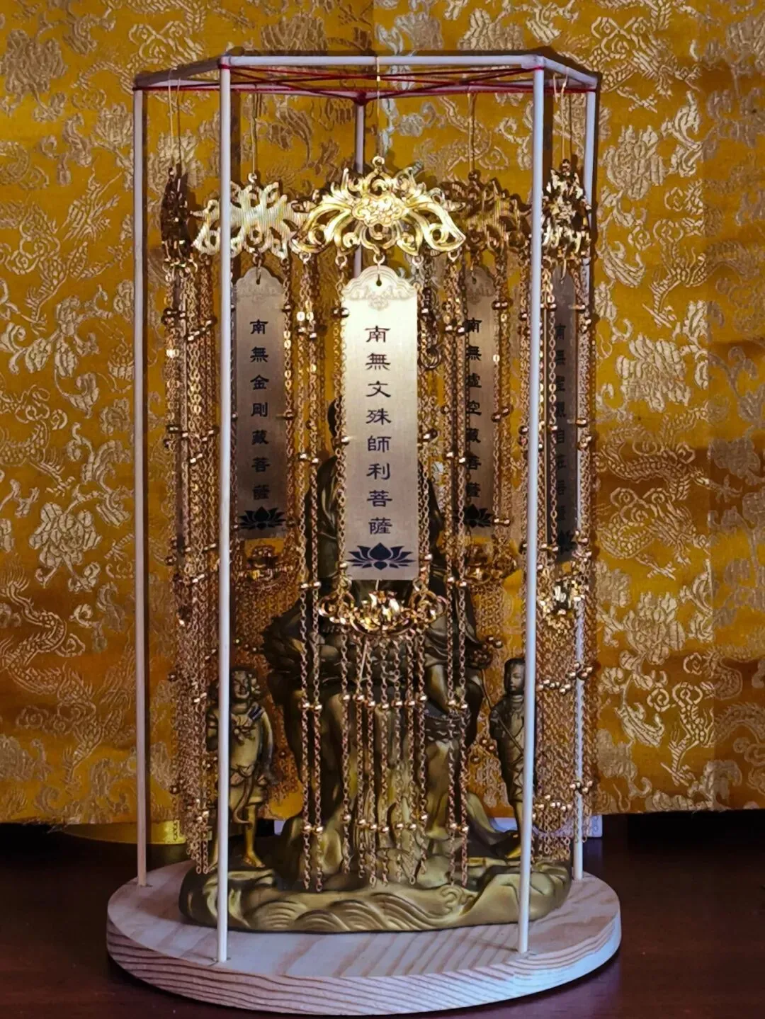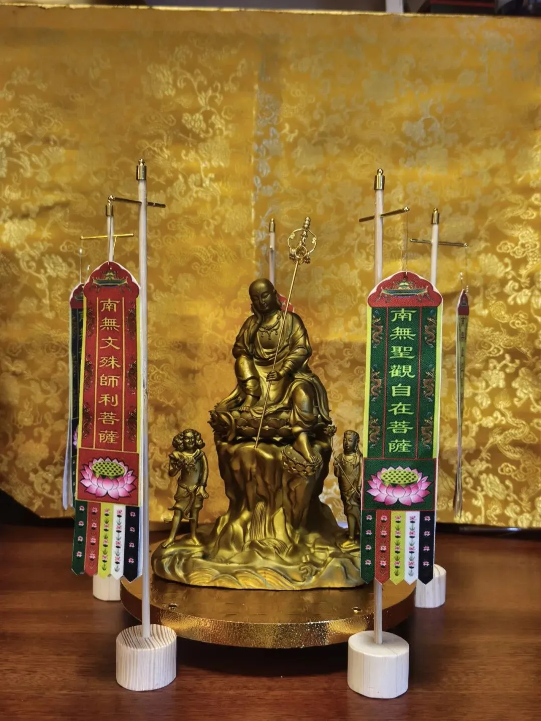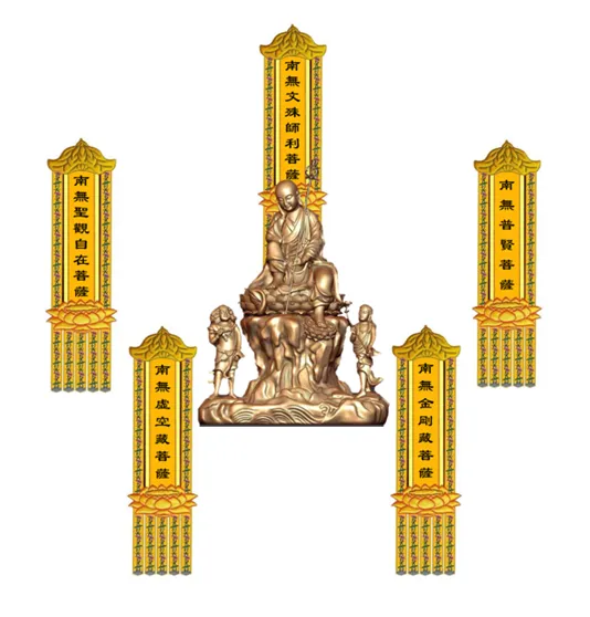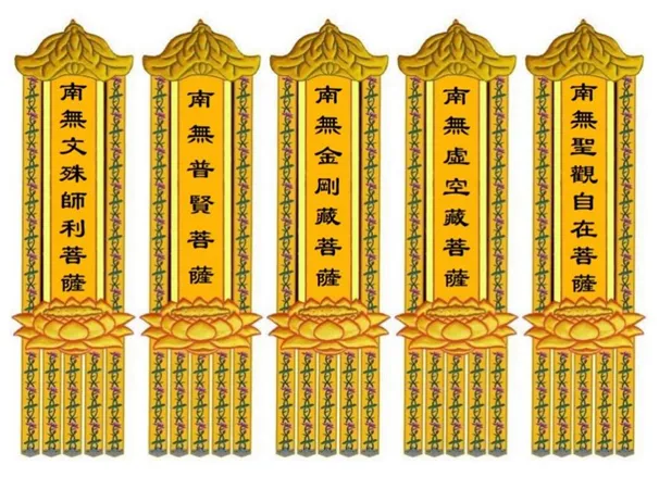 这五支幡上面分别要绣上这五位菩萨的名号,一支幡就是一个名号,像是文殊菩萨一支、普贤菩萨一支、金刚藏菩萨一支、虚空藏菩萨一支、然后圣观自在菩萨摩诃萨一支,你要绣上这些名号,绣上名号以后,你就把这五支幡像五角星一样直接放在延命地藏像的五个方向。