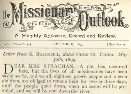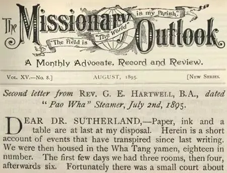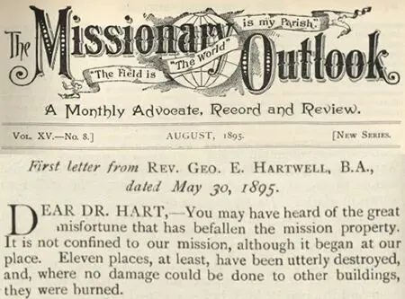 就在教案发生后的第三天,5月30日,何忠义给刚到嘉定的赫斐秋写了一封信,告诉他成都发生了教案。这封信登在The Missionary Outlook 1895年8月期上。在这封信中,何忠义先是叙述了启尔德和斯蒂文森院子那边发生的事情。对于何忠义来说,因为他并不是亲历者,也是他到了衙门见到启尔德他们后才听说的。所以,他信中的这部分内容就不再赘述了,而主要关注的是他和家人在教案中亲身经历的遭遇。
