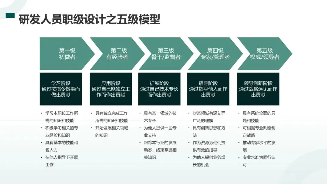 技术通道:初级工程师→中级工程师→高级工程师→技术专家→首席科学家→技术顾问,每个层级对应明确的能力要求、薪酬标准与权限(如技术专家可主导核心技术决策、分配研发资源)。