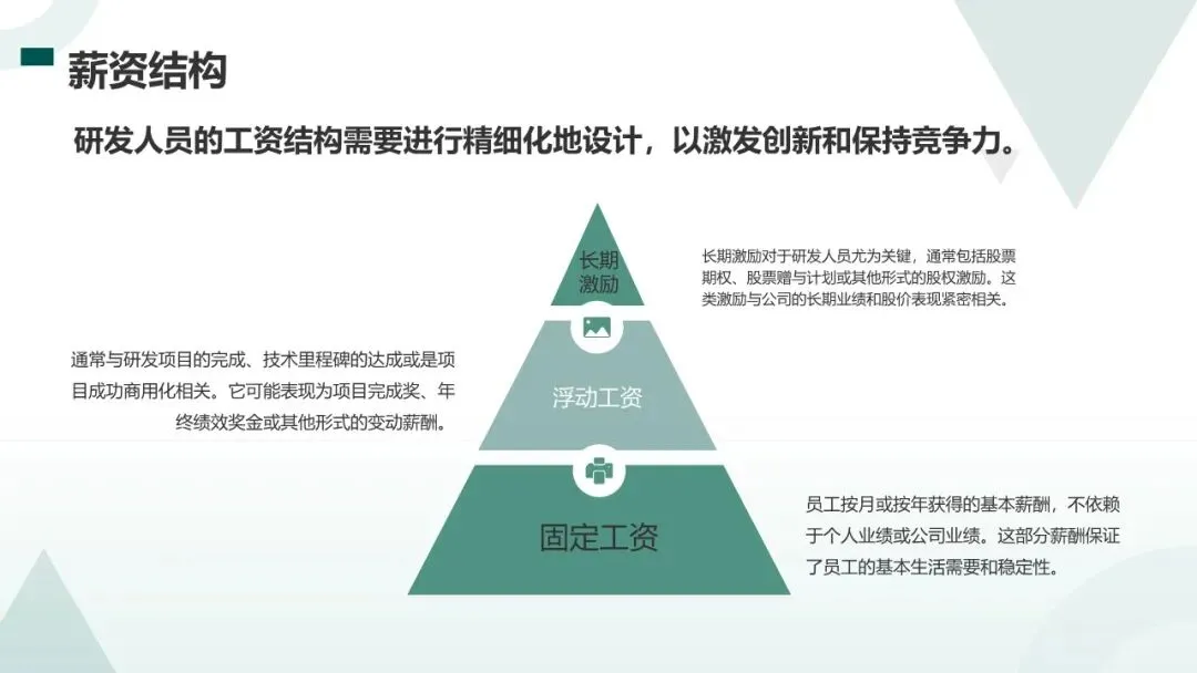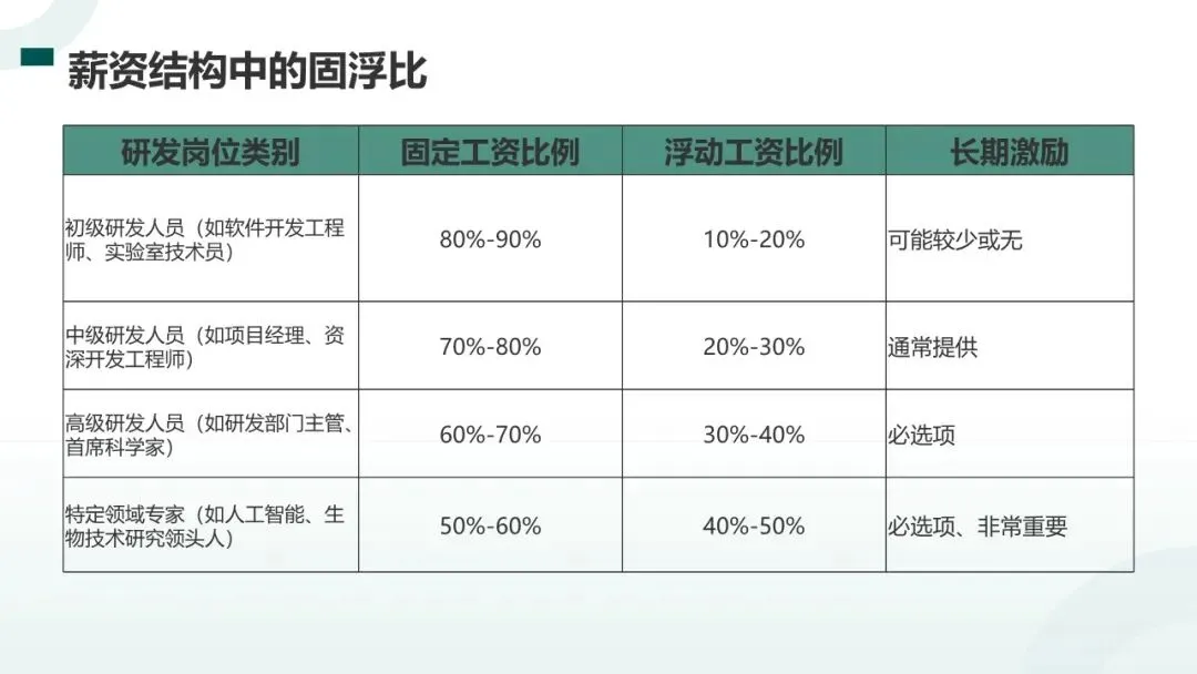 浮动薪酬:占比根据岗位层级调整(基层研发20%-30%,骨干/专家40%-60%),核心绑定研发成果,避免“大锅饭”。