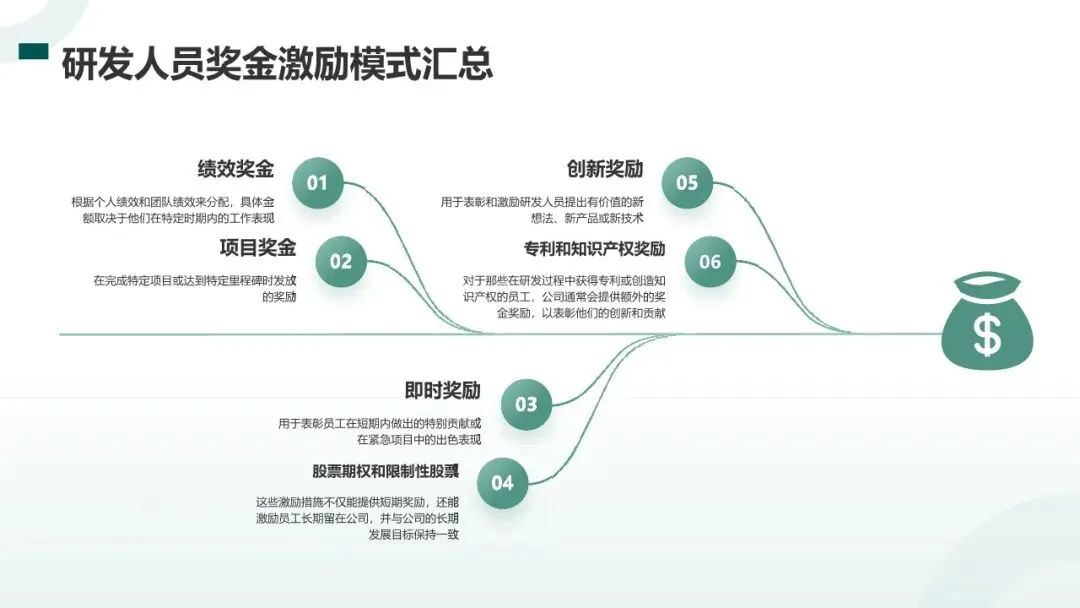 股权激励/期权:向核心研发人员授予股权或期权,设定锁定期(如3-5年),按“业绩达标+服务年限”解锁,让研发人员成为企业股东,分享企业成长红利。适合成熟期、有上市规划的企业。