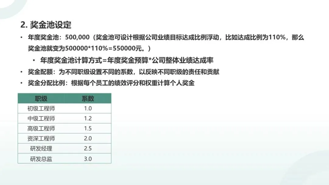 固定薪酬:基于研发人员的技术层级(如初级工程师、中级工程师、高级工程师、技术专家、首席科学家)、学历背景、行业经验设定,保障基本生活与职业尊严。核心是“宽带薪酬”设计,同一层级内拉开薪酬差距,为技术深耕者提供薪酬上升空间(如高级工程师可细分3-5个档位,对应不同技术能力与贡献)。