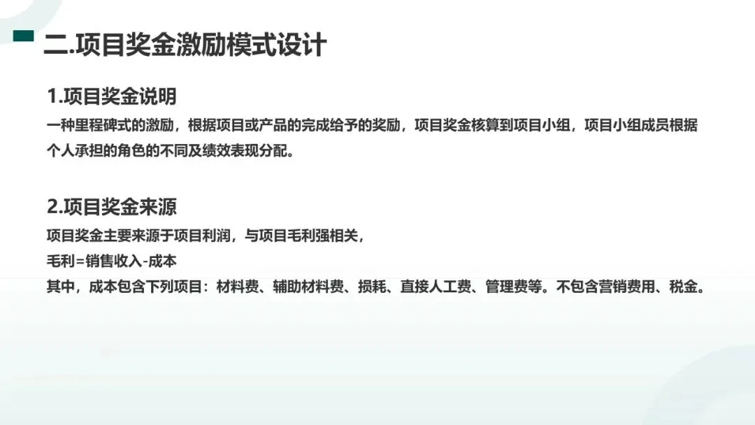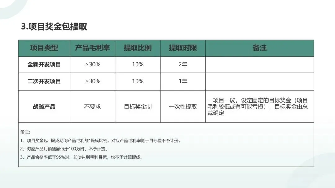 项目跟投机制:针对重大研发项目(如新产品线研发、重大技术升级),允许核心研发人员以自有资金跟投,项目盈利后按跟投比例分享收益,亏损时按约定承担有限风险,激发核心人员对项目的责任感。