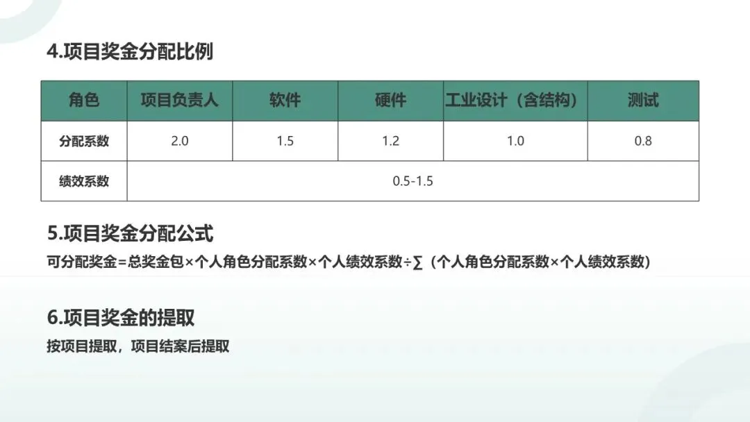 项目奖金:针对重点研发项目(如新产品开发、核心技术突破、技术迭代升级),设定项目里程碑奖金(如需求落地、测试通过、上线验收),按“贡献度”分配(核心负责人占比30%-40%,核心成员20%-30%,普通成员10%-20%),由项目负责人牵头制定分配方案,公示后执行。
