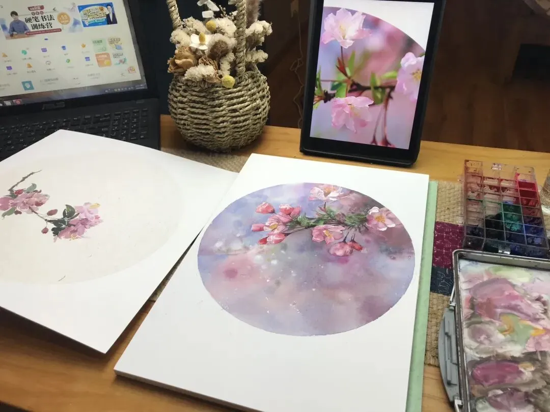 • 画笔:大号羊毫刷(铺色)、中号圆头笔(细节)、小号勾线笔(花枝)