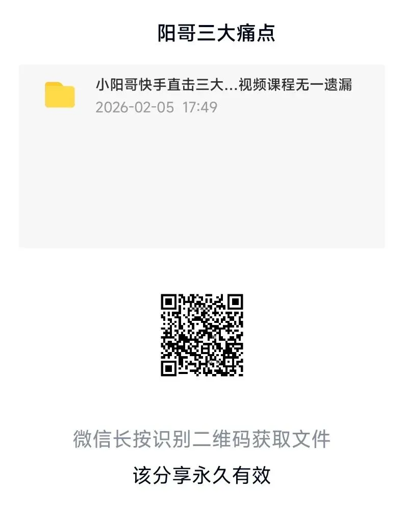【超级会员V4】通过百度网盘分享的文件:阳哥三大痛点链接:https://pan.baidu.com/s/12DIk2Z6010q7D-smB0D7ug 提取码:8888复制这段内容打开「百度网盘APP 即可获取」