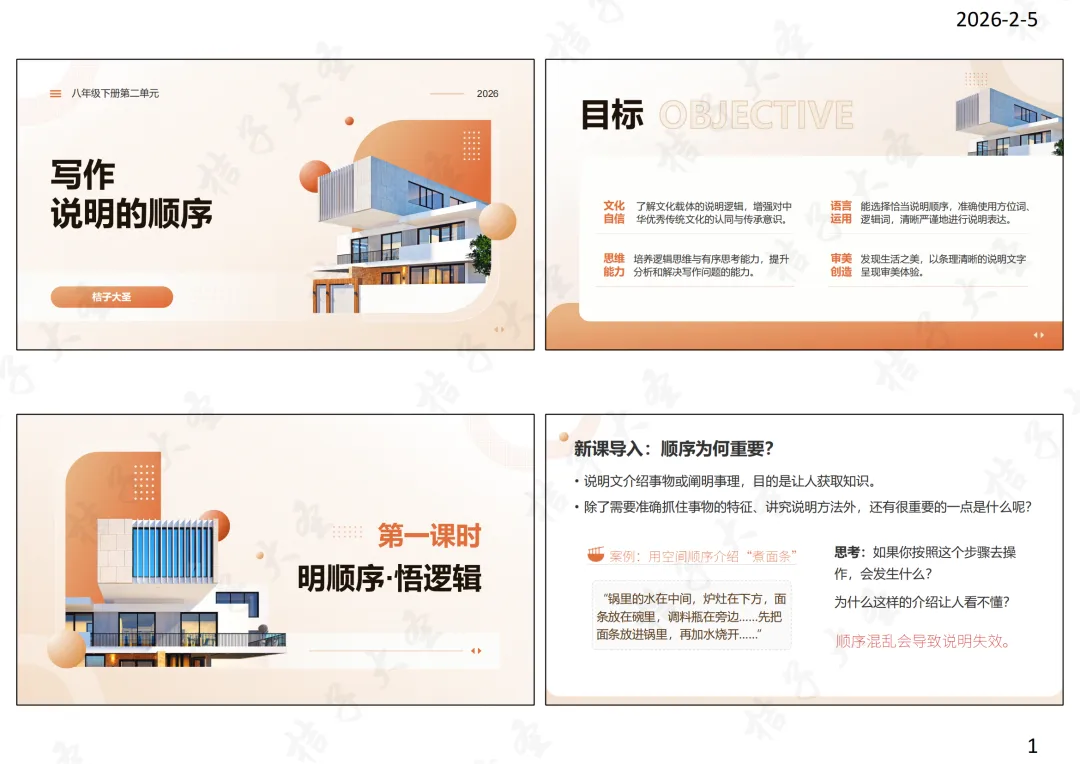教师语言:没错,说明顺序就像文章的“导航”,能让读者清晰把握内容逻辑。今天我们就来学习如何根据说明对象和内容,选择并安排合适的说明顺序。