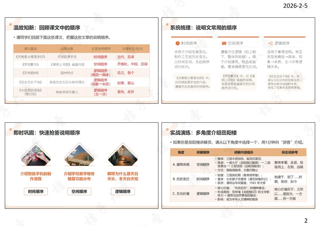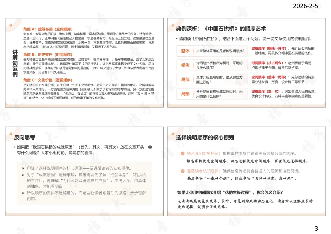教师语言:由此可见,一篇说明文往往以一种顺序为主,也可融合其他顺序。比如介绍岳阳楼时,可先以时间顺序简述其历史,再以空间顺序介绍其建筑结构,最后以逻辑顺序分析其文化价值,这样能让说明更全面、有条理。