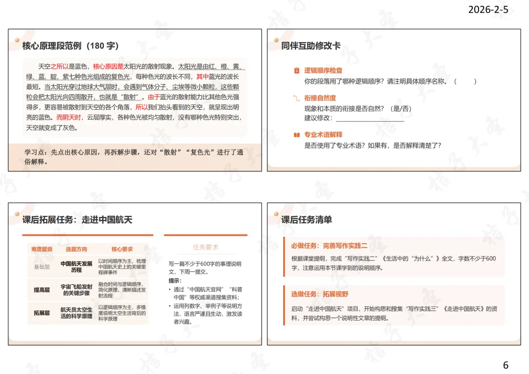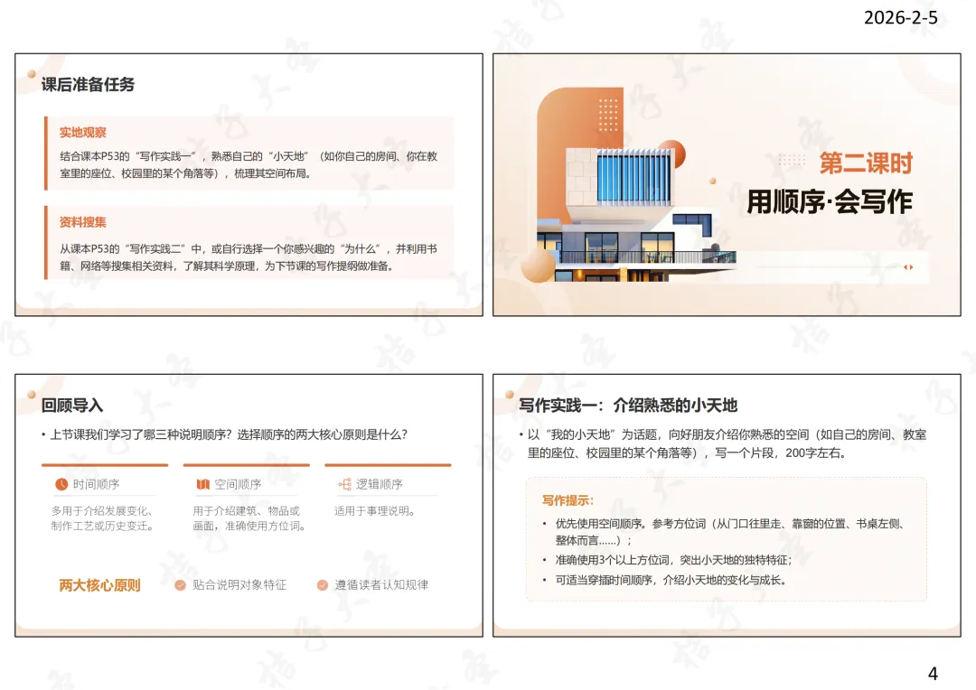 教师语言:理解原则是为了更好地运用。下节课,我们将运用这些原则,完成两个核心的写作任务:一是用空间顺序介绍你的“小天地”,二是用逻辑顺序探究一个“为什么”。请大家为这两个任务提前做些准备。