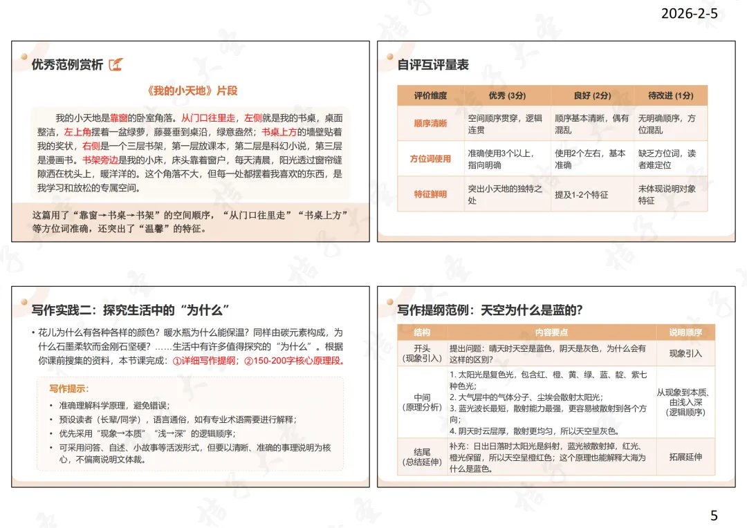 【设计意图】从学生熟悉的生活场景切入,降低写作难度,重点训练空间顺序的运用和方位词的准确表达,通过教师示范点评和互评修改环节,让学生明确“好的说明片段”的核心要素,避免互评流于形式,通过互评互改发现问题、优化表达。