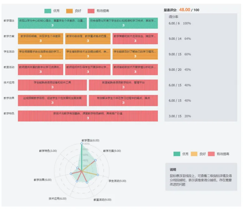 以“量表评分+AI分析”双评审模式,定性定量,对教学设计、教学执行进行量化评估,评分项更细节、问题更深入、维度更全面,使教学问题更立体,课堂观察更科学。