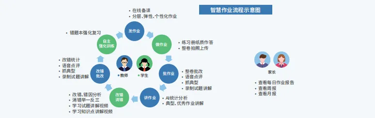 智慧作业系统搭载全新的信息技术平台,可还原真实作业场景,赋能教师备课、教研、布置作业、批改作业、讲评作业和学生完成作业、改错消错、巩固提升等作业全环节,实现个性化分层布置作业、智能批改,给教师和学生双向减负。借助系统动态采集的学生每日作业学情,生成多维度的学情报告,使得教师对学生的评价更加客观、全面、及时。