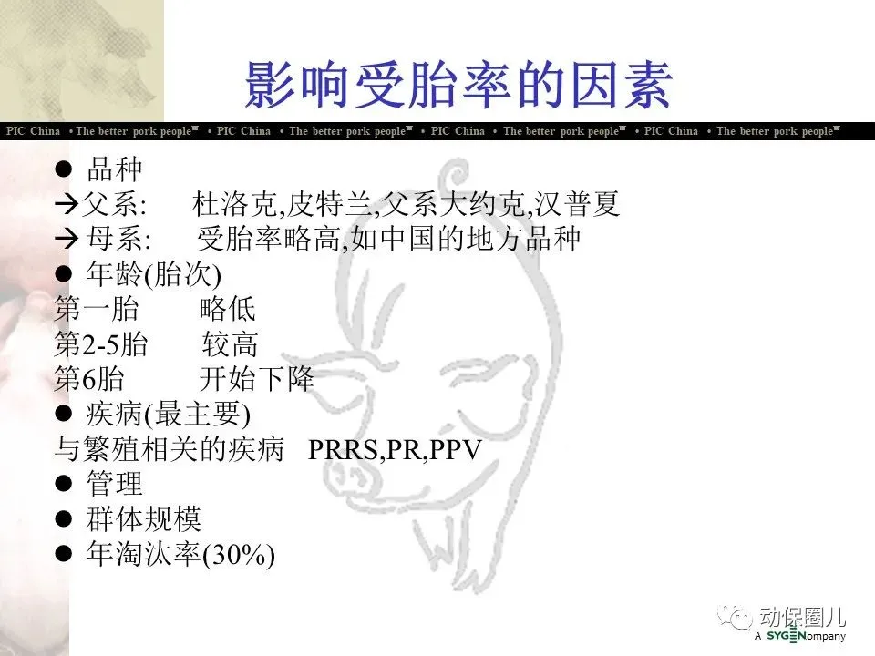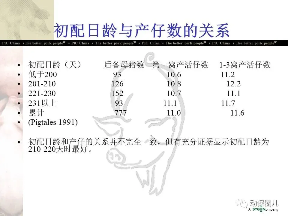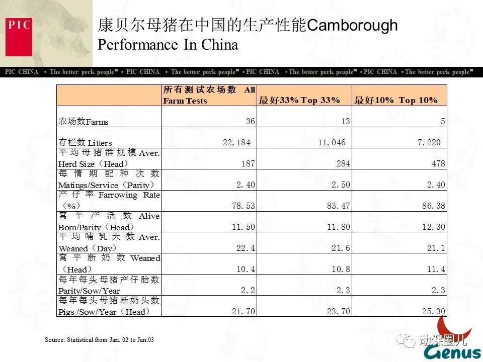 10 最客户化的育种:PIC有客户化得选择指数,可以满足客户的特殊需要,加上PIC猪在综合经济效益上优势明显,从而特别受到大型养猪企业的欢迎。如美国最大的30家养猪企业(合计占全美母猪数及肥育猪数的一半以上)中,有26家使用PIC品种,使用量占这30家企业使用种猪总数量的50%以上。