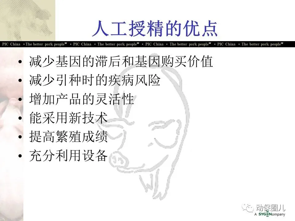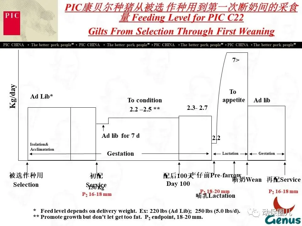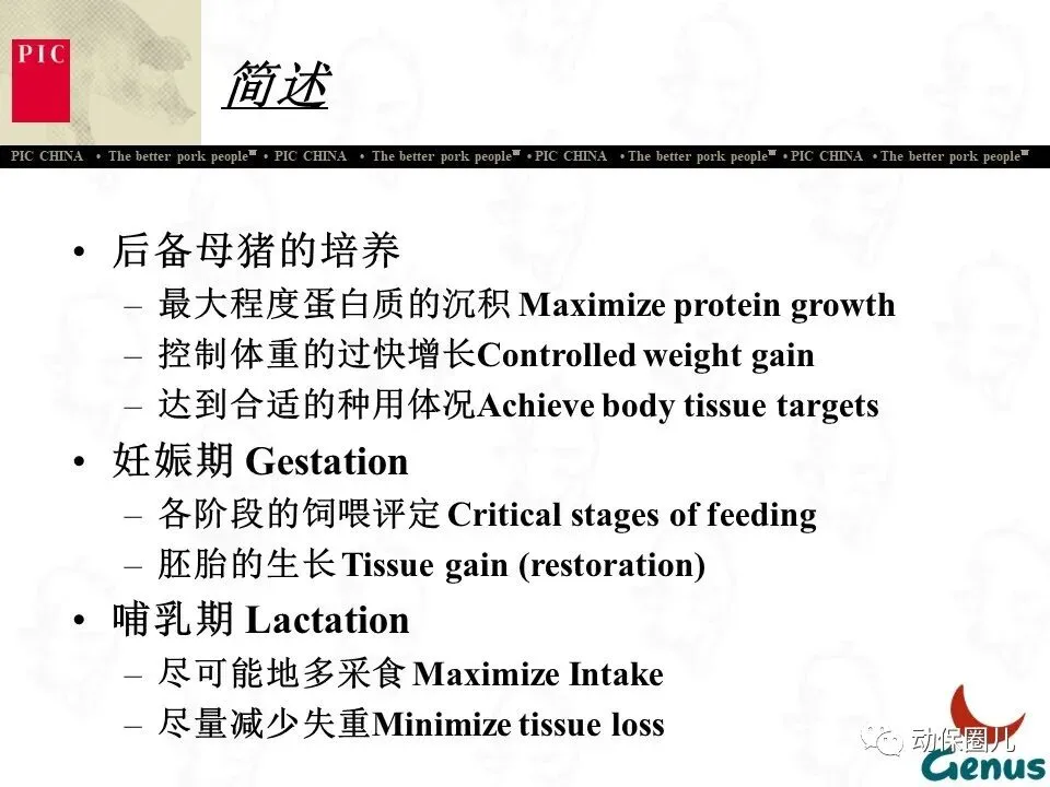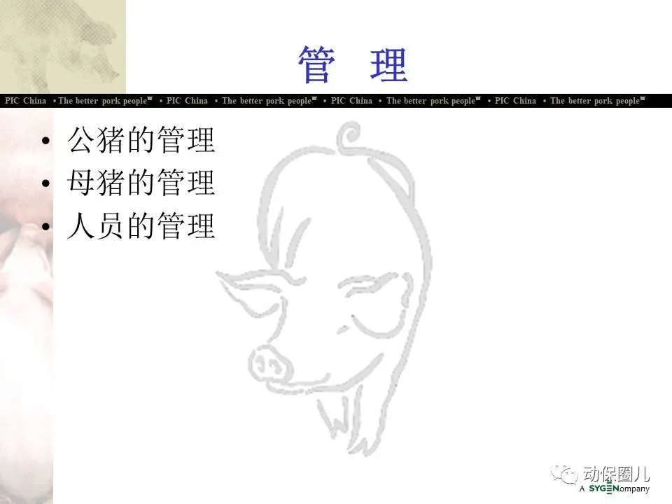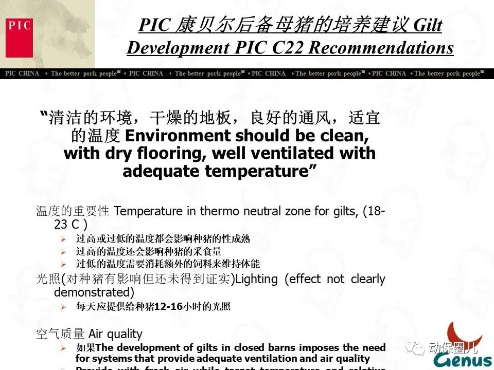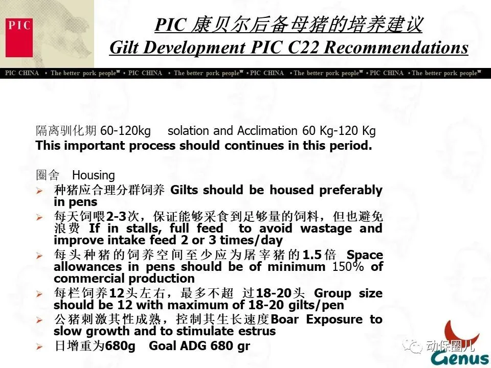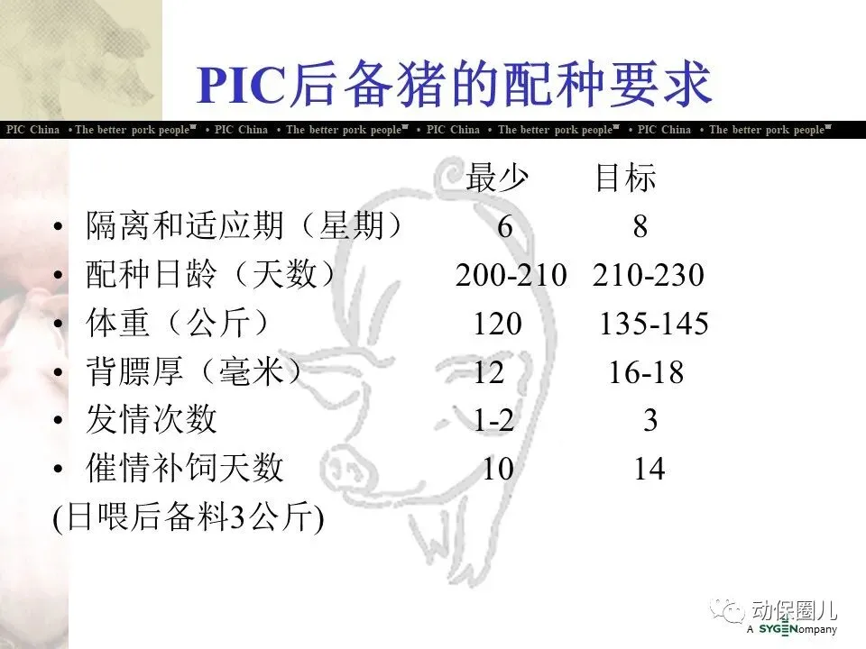 公司宗旨 为不同的客户提供优秀的种猪和全面的服务,为猪肉链各环节的成员创造更多的利润和价值,从而为消费者提供安全、营养、美味的猪肉产品。随着分子育种及标记辅助BLUP等新技术的不断应用,PIC将不断向中国市场推出在生长、繁殖、胴体、肉质及抗病等性能上有明显优势的种猪。