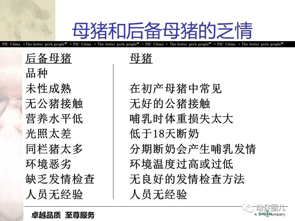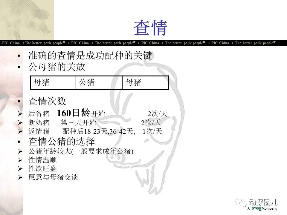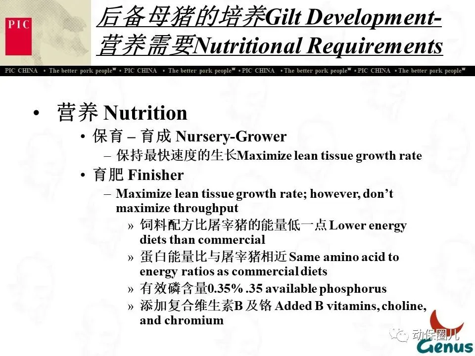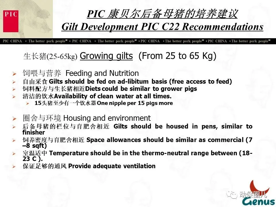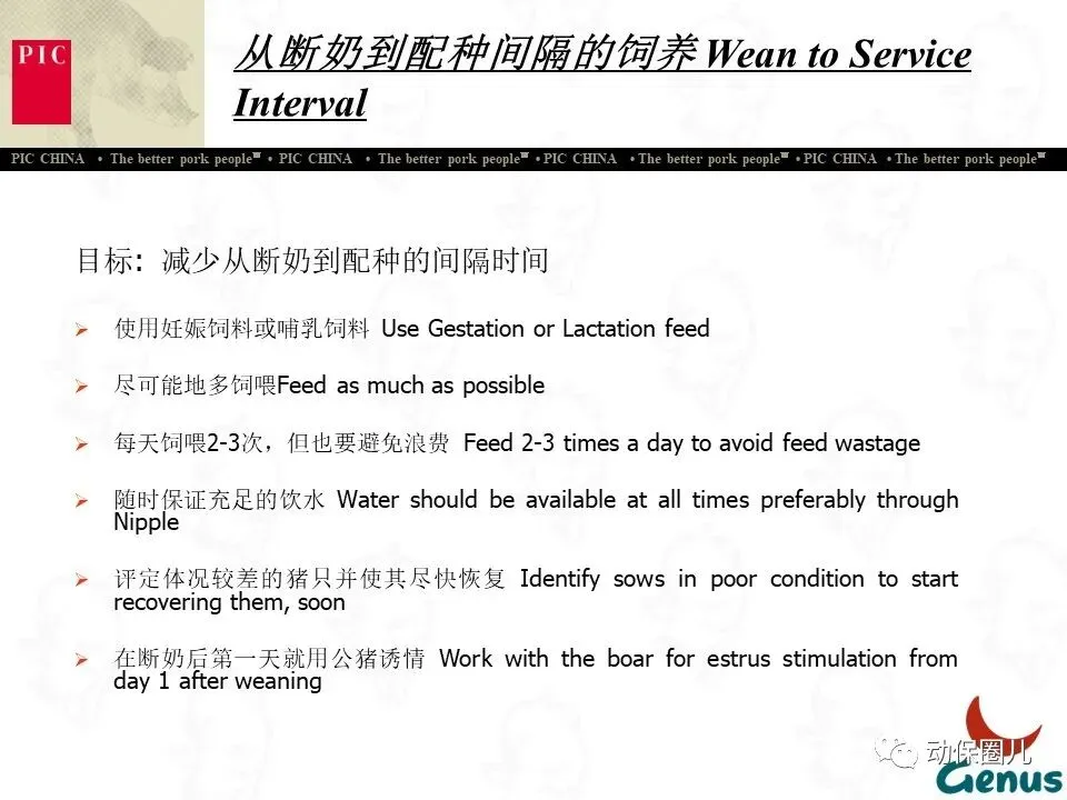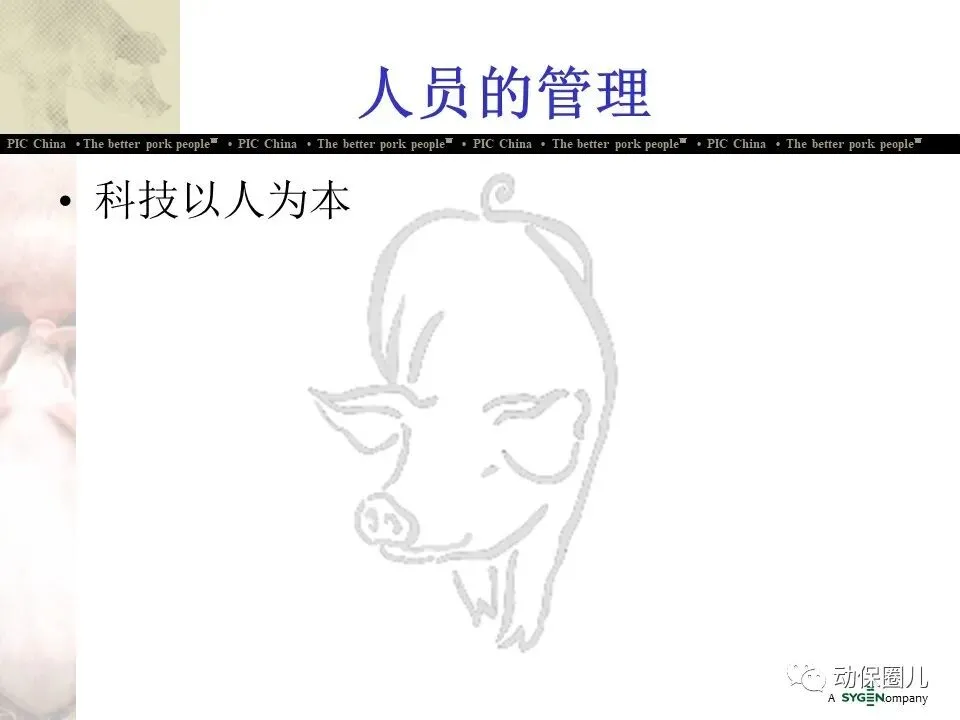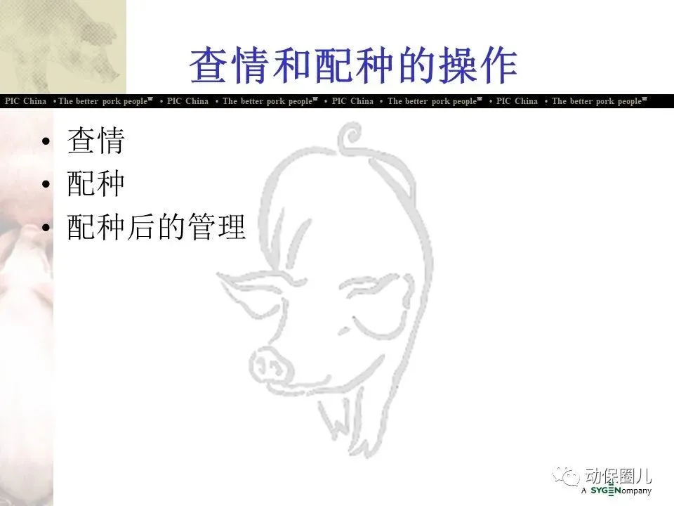 公司宗旨 为不同的客户提供优秀的种猪和全面的服务,为猪肉链各环节的成员创造更多的利润和价值,从而为消费者提供安全、营养、美味的猪肉产品。随着分子育种及标记辅助BLUP等新技术的不断应用,PIC将不断向中国市场推出在生长、繁殖、胴体、肉质及抗病等性能上有明显优势的种猪。
