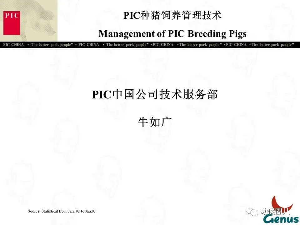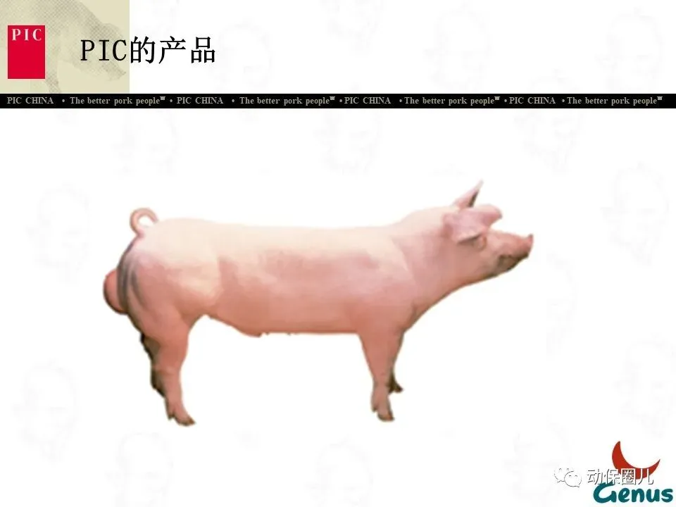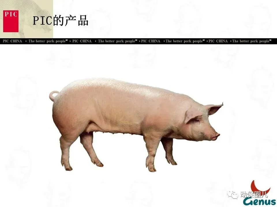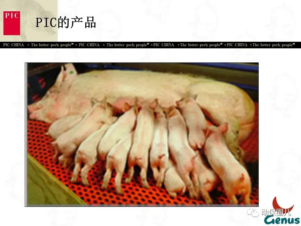 PIC种猪改良国际集团,1962年成立于英国,是世界上最早专业从事种猪改良的公司之一。经过近50年的发展,PIC在全球设立了30多个合作公司,年销售种猪300多万头,是全球最大的种猪改良公司。PIC集团内,美国PIC公司是发展势头最好,市场占有率和利润额最高、种猪资源以及各方面遗传技术数据最为优秀的公司,年营业额达670亿美元。PIC是Genus国际集团的全资子公司,Genus国际集团还包括全球最大的种肉牛、种奶牛公司ABS。