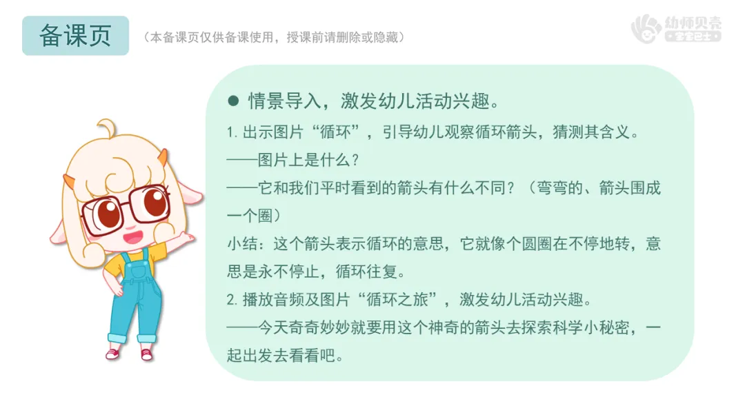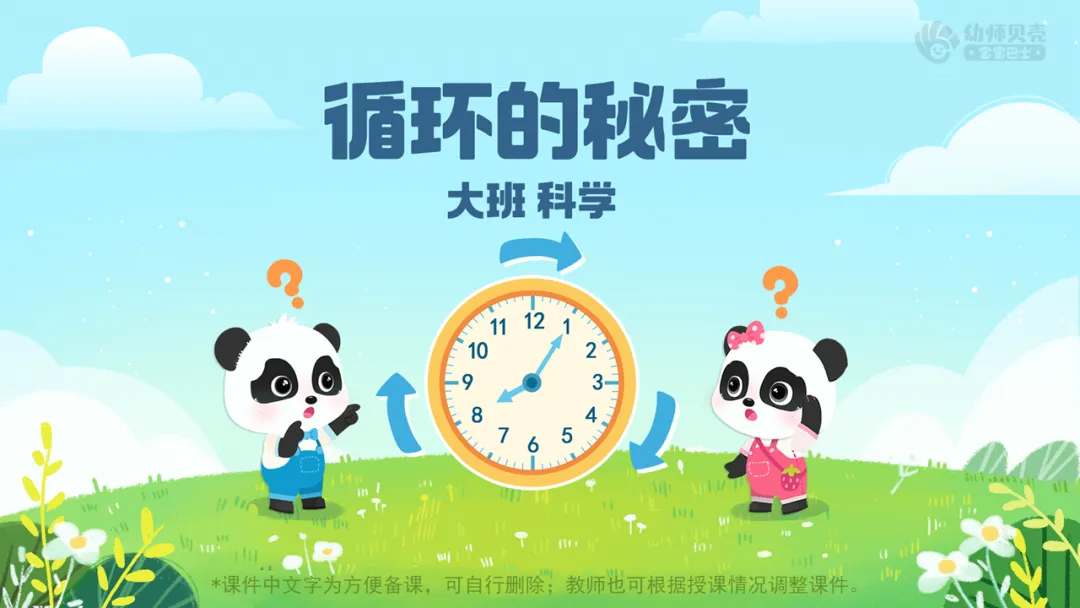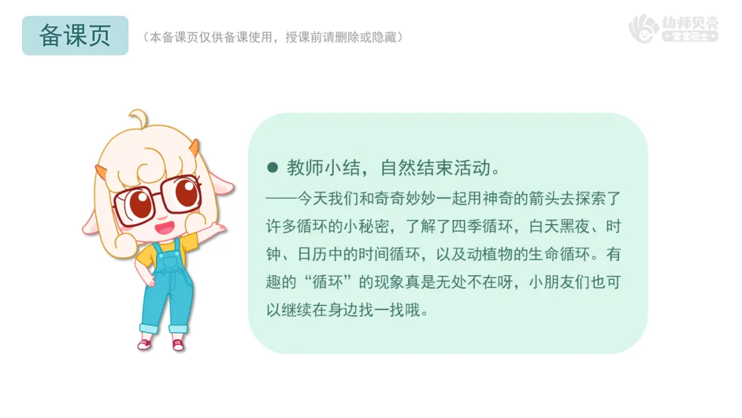 ——今天我们和奇奇妙妙一起用神奇的箭头去探索了许多循环的小秘密,了解了四季循环,白天黑夜、时钟、日历中的时间循环,以及动植物的生命循环。有趣的“循环”的现象真是无处不在呀,小朋友们也可以继续在身边找一找哦。