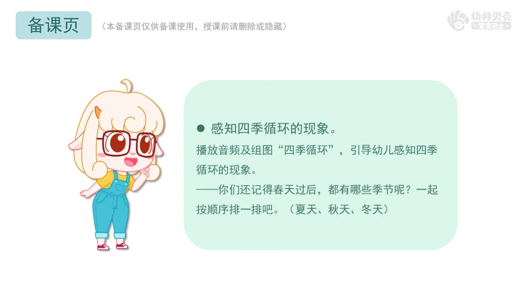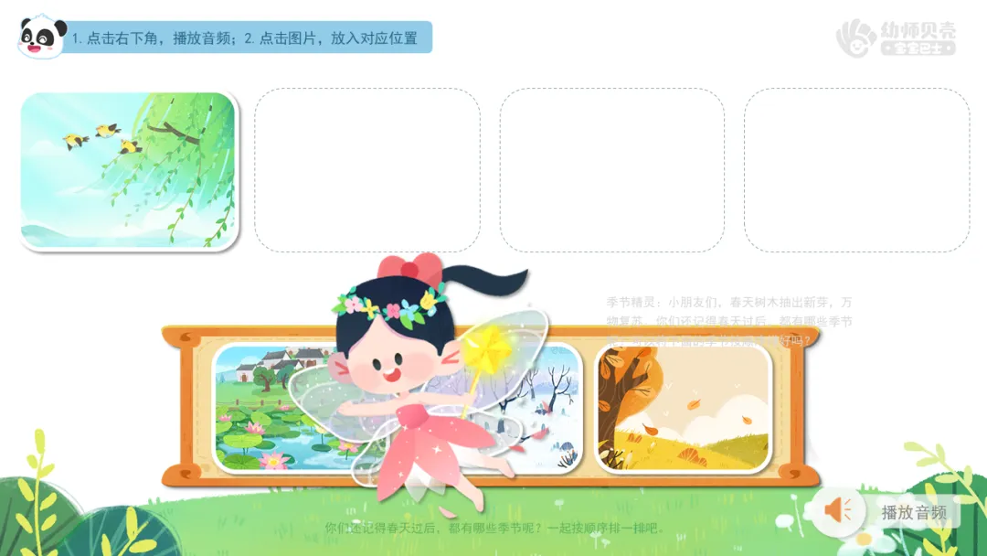 播放音频及组图“四季循环”,引导幼儿感知四季循环的现象。