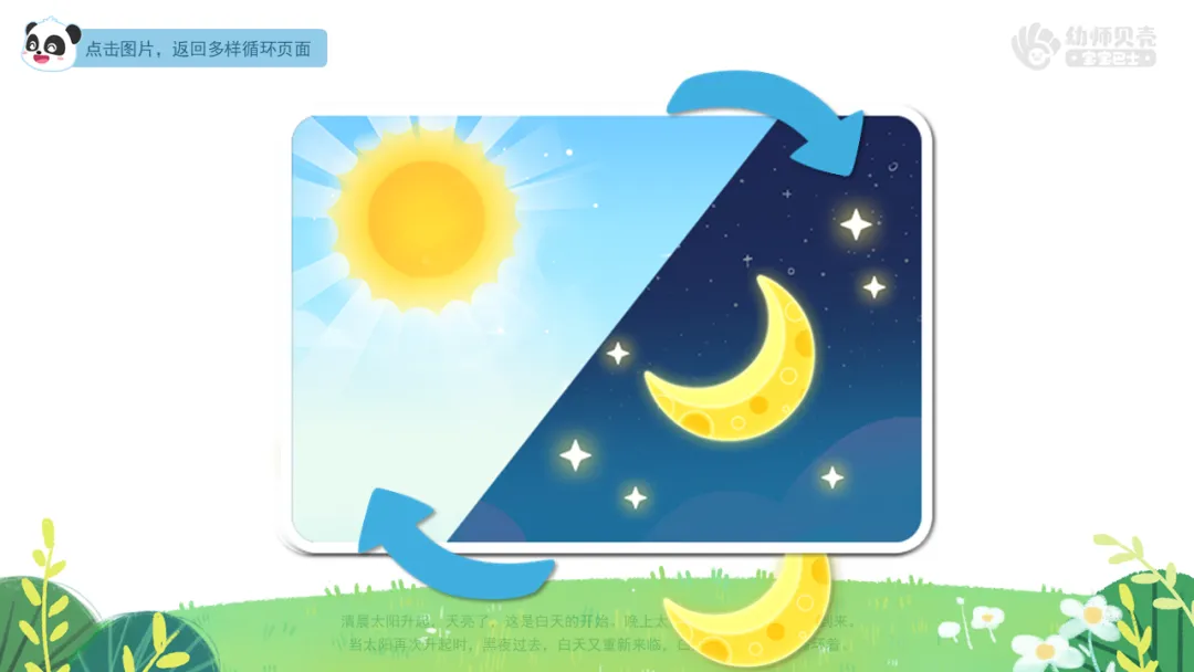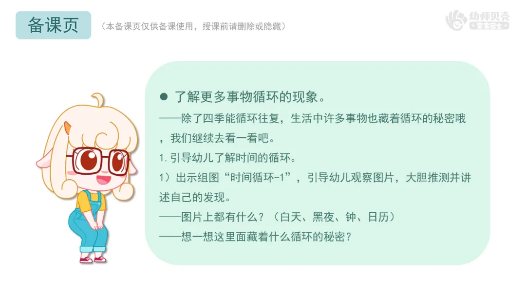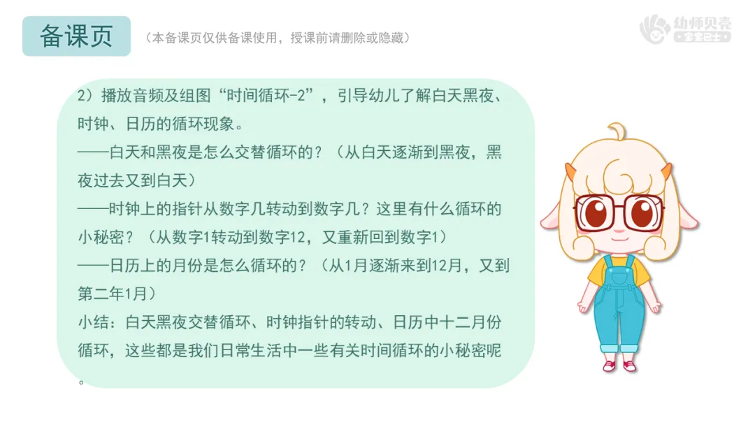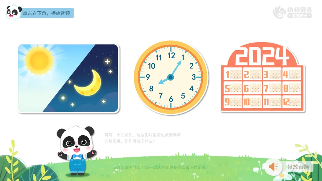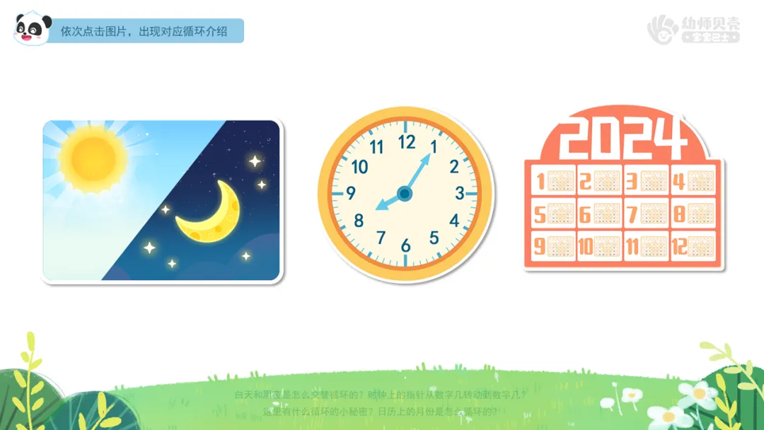 ——想一想这里面藏着什么循环的秘密?2)播放音频及组图“时间循环-2”,引导幼儿了解白天黑夜、时钟、日历的循环现象。