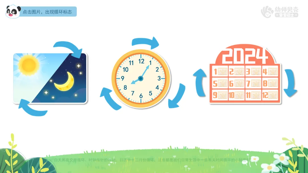 小结:白天黑夜交替循环、时钟指针的转动、日历中十二月份循环,这些都是我们日常生活中一些有关时间循环的小秘密呢。