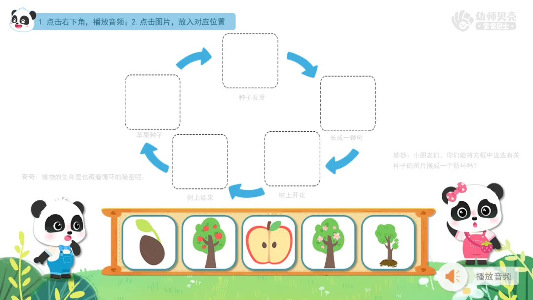 ——在方框中这些图片,都是关于一颗种子的生命循环。你们能试着按照正确的顺序将它们摆放到虚框里,并说一说它们是怎么循环的?
