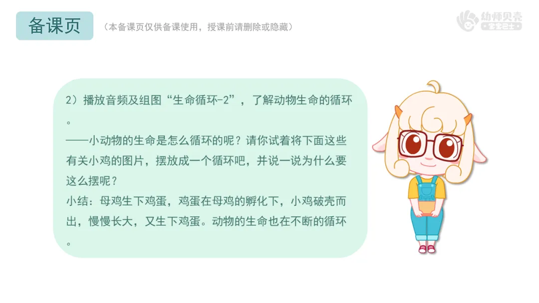 小结:母鸡生下鸡蛋,鸡蛋在母鸡的孵化下,小鸡破壳而出,慢慢长大,又生下鸡蛋。动物的生命也在不断的循环。