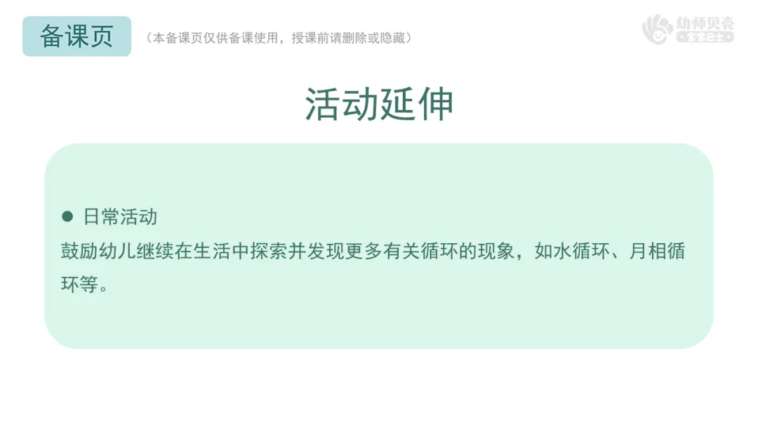 鼓励幼儿继续在生活中探索并发现更多有关循环的现象,如水循环、月相循环等。