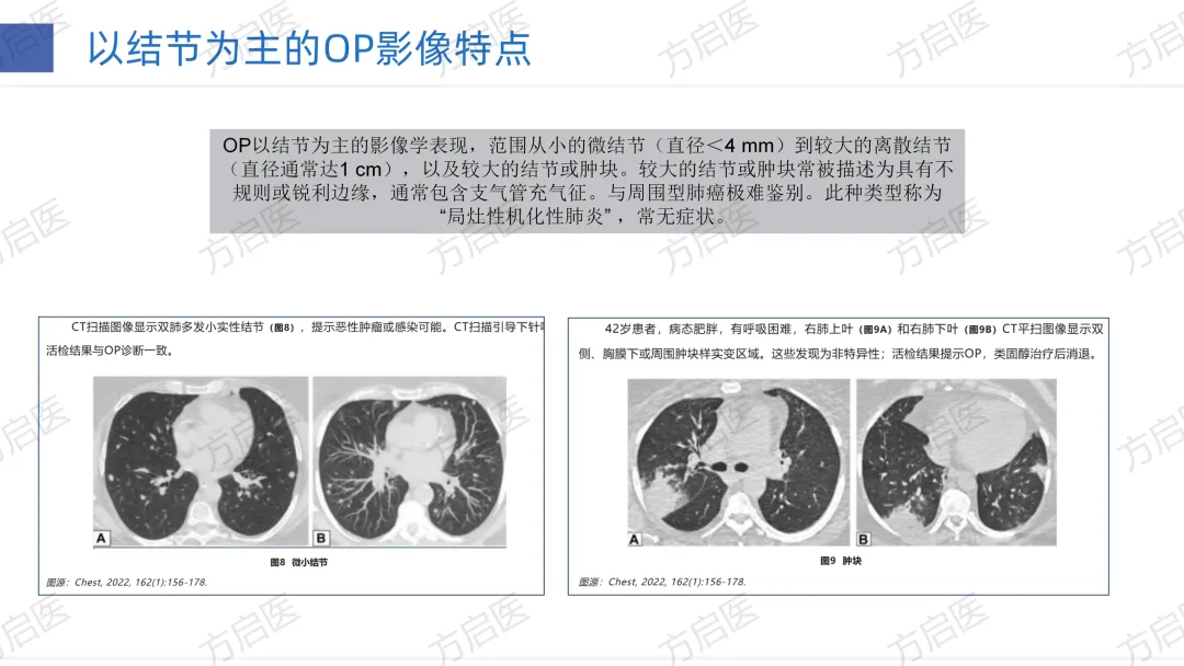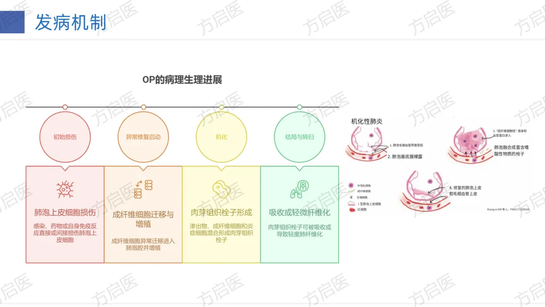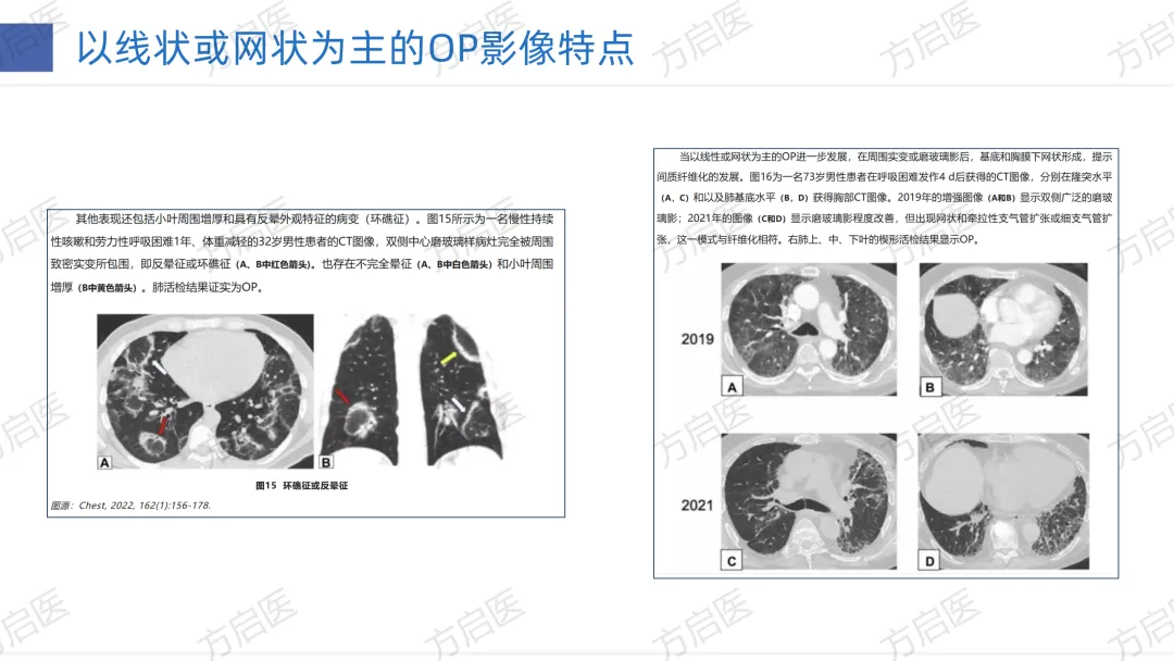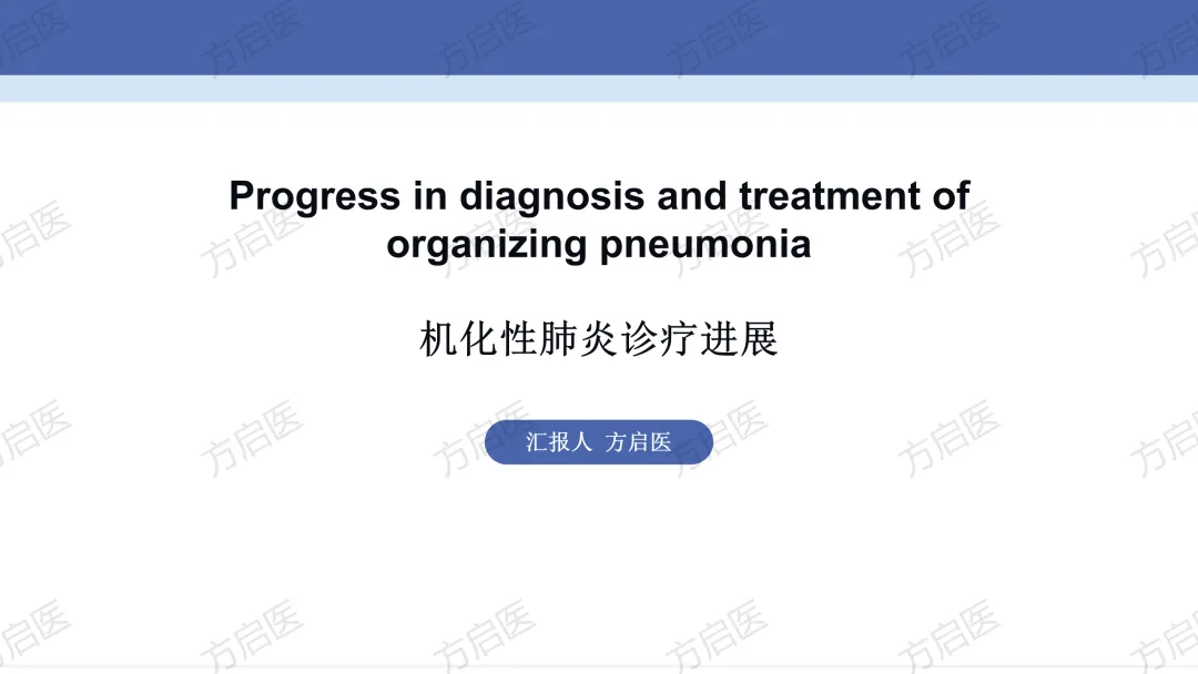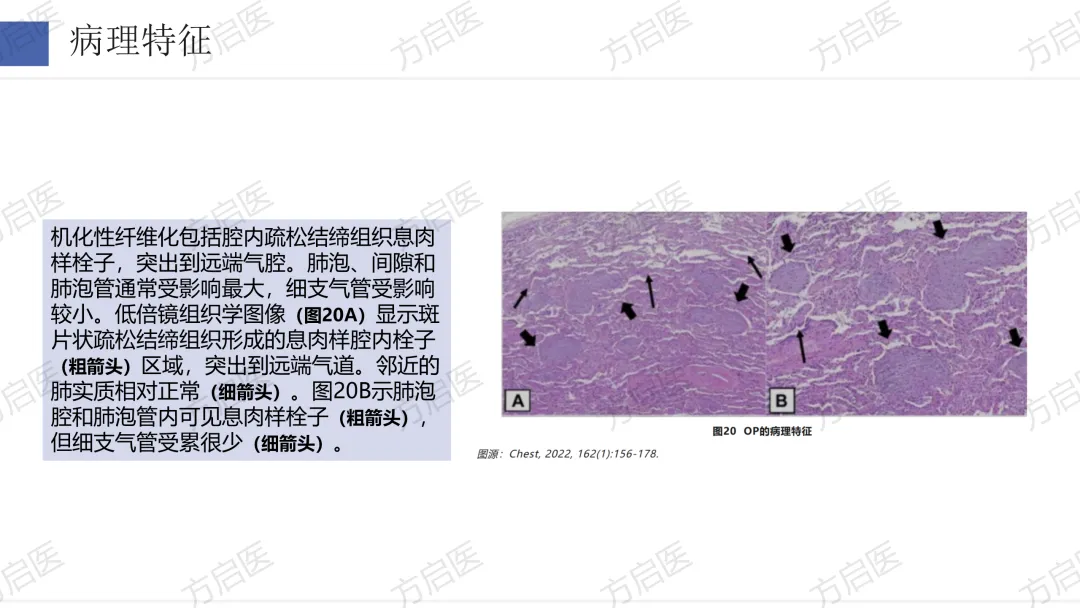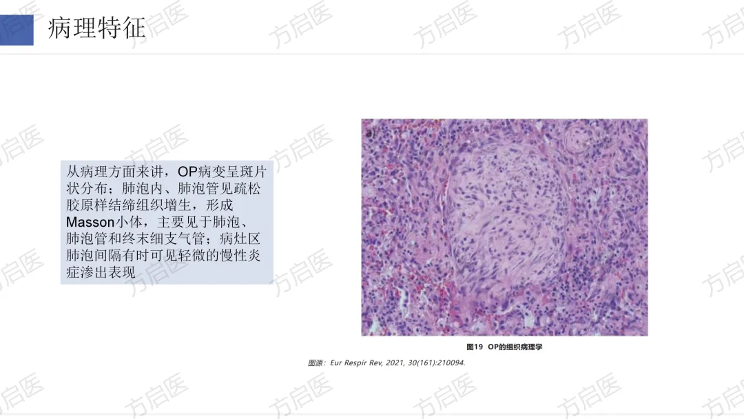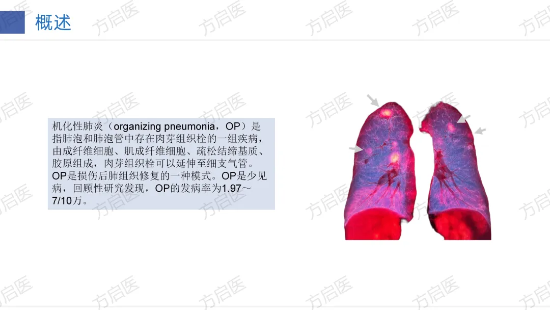 机化性肺炎(organizing pneumonia,OP)是指肺泡和肺泡管中存在肉芽组织栓的一组疾病,由成纤维细胞、肌成纤维细胞、疏松结缔基质、胶原组成,肉芽组织栓可以延伸至细支气管。OP是损伤后肺组织修复的一种模式。OP是少见病,回顾性研究发现,OP的发病率为1.97~7/10万。