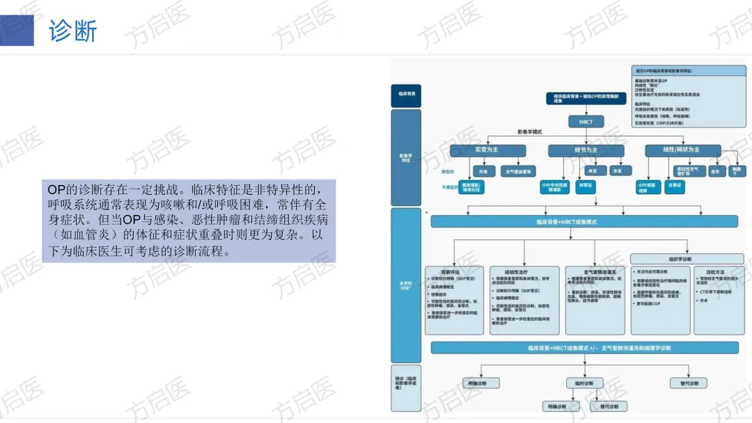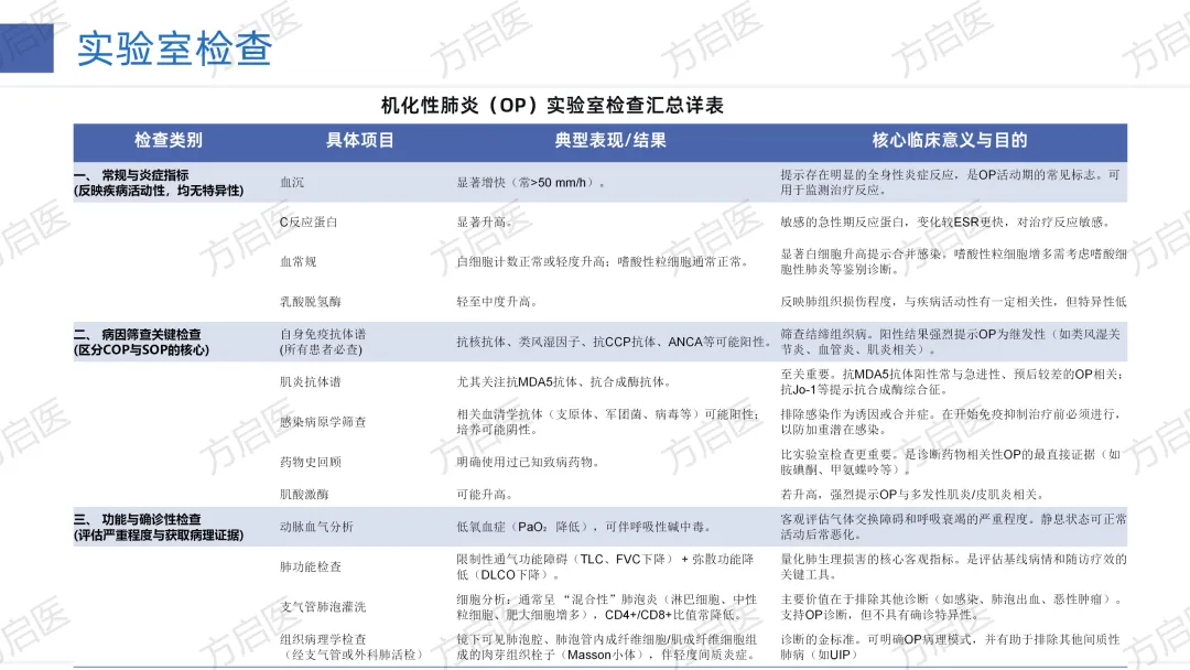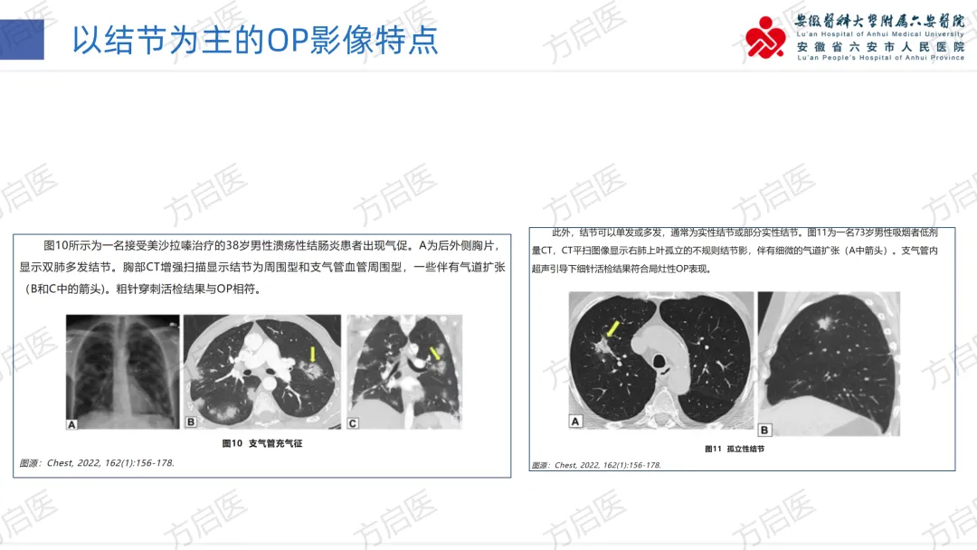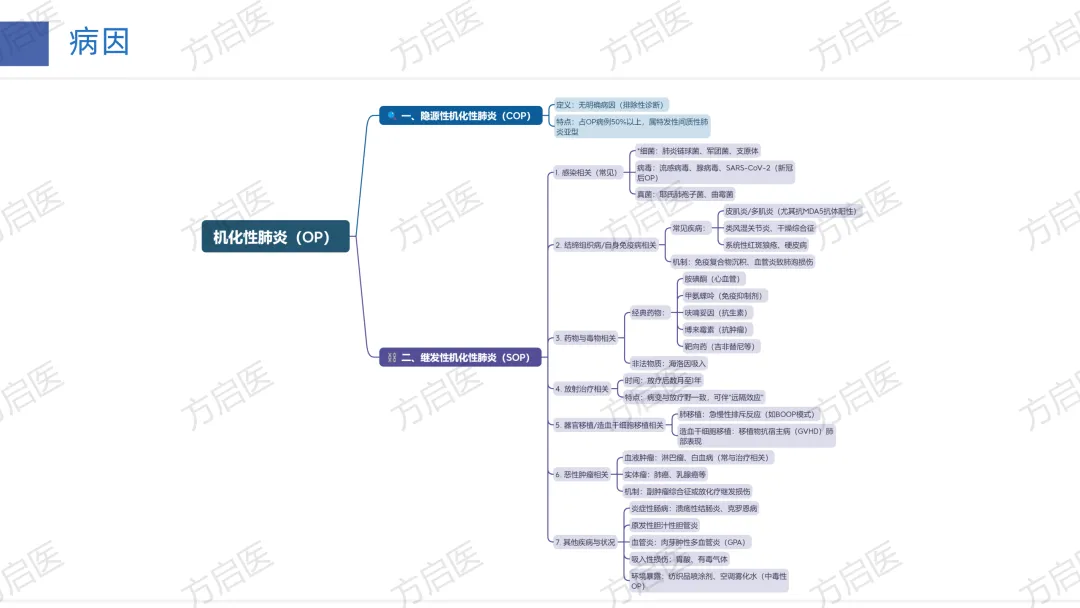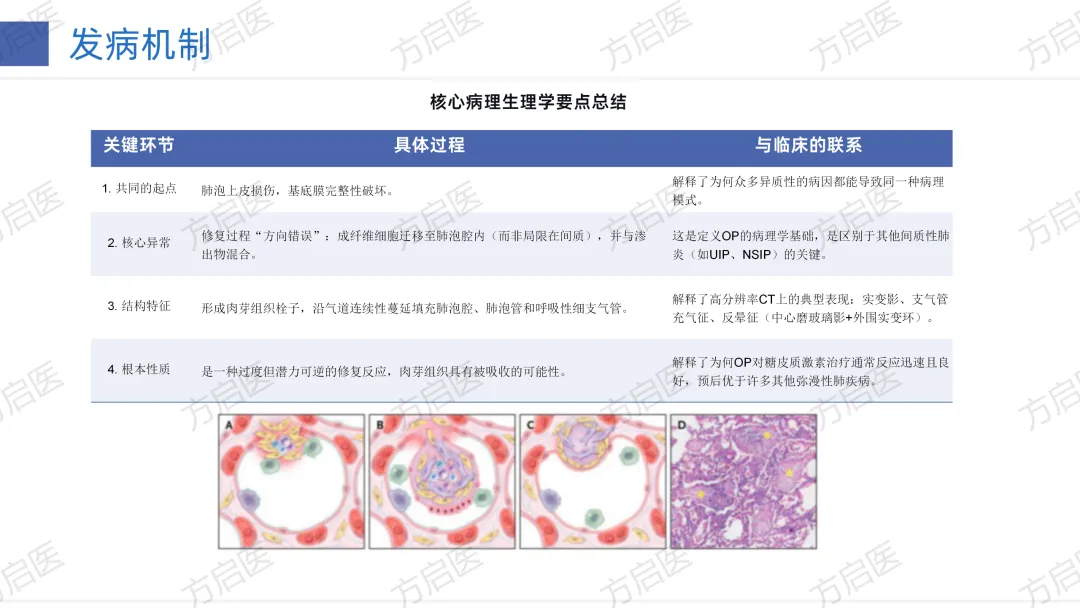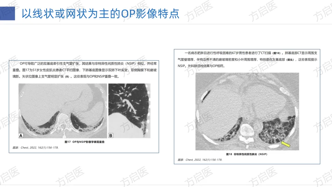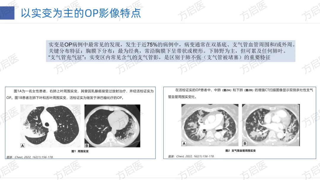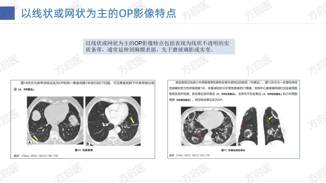机化性肺炎(organizing pneumonia,OP)是指肺泡和肺泡管中存在肉芽组织栓的一组疾病,由成纤维细胞、肌成纤维细胞、疏松结缔基质、胶原组成,肉芽组织栓可以延伸至细支气管。OP是损伤后肺组织修复的一种模式。OP是少见病,回顾性研究发现,OP的发病率为1.97~7/10万。