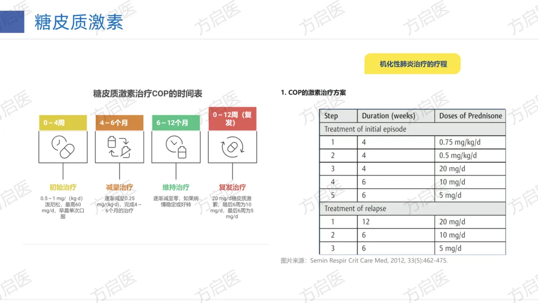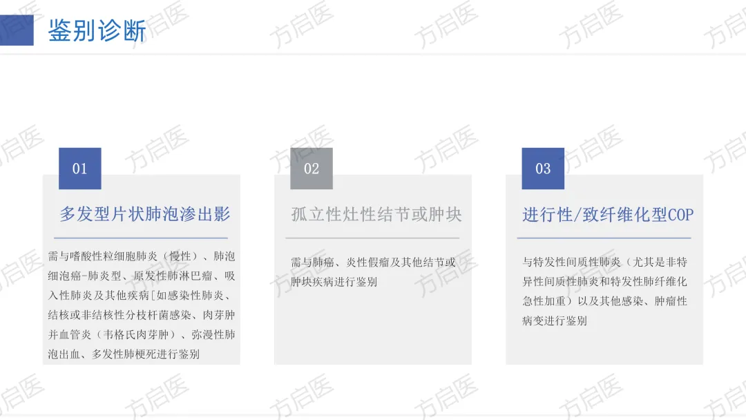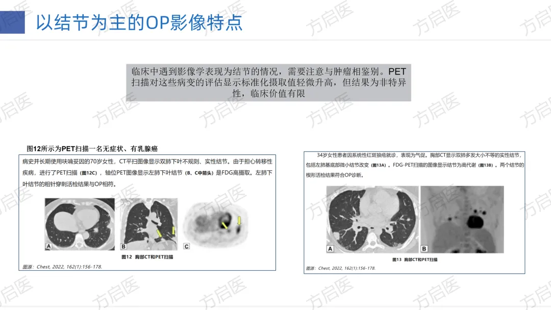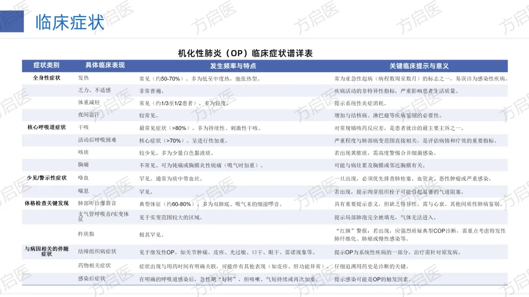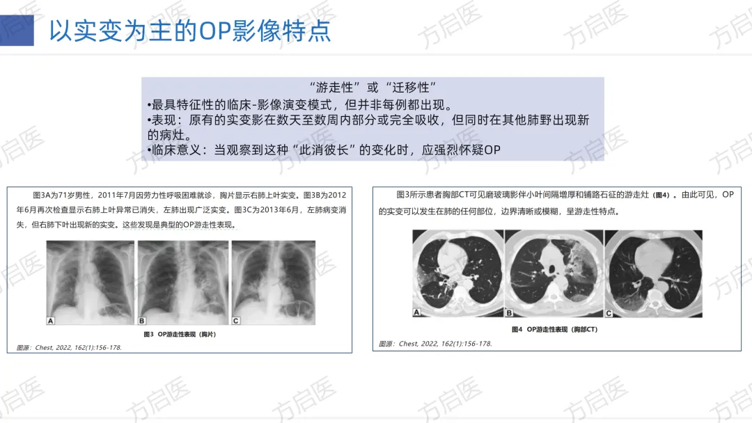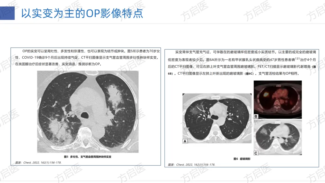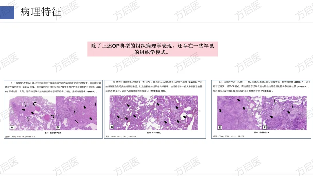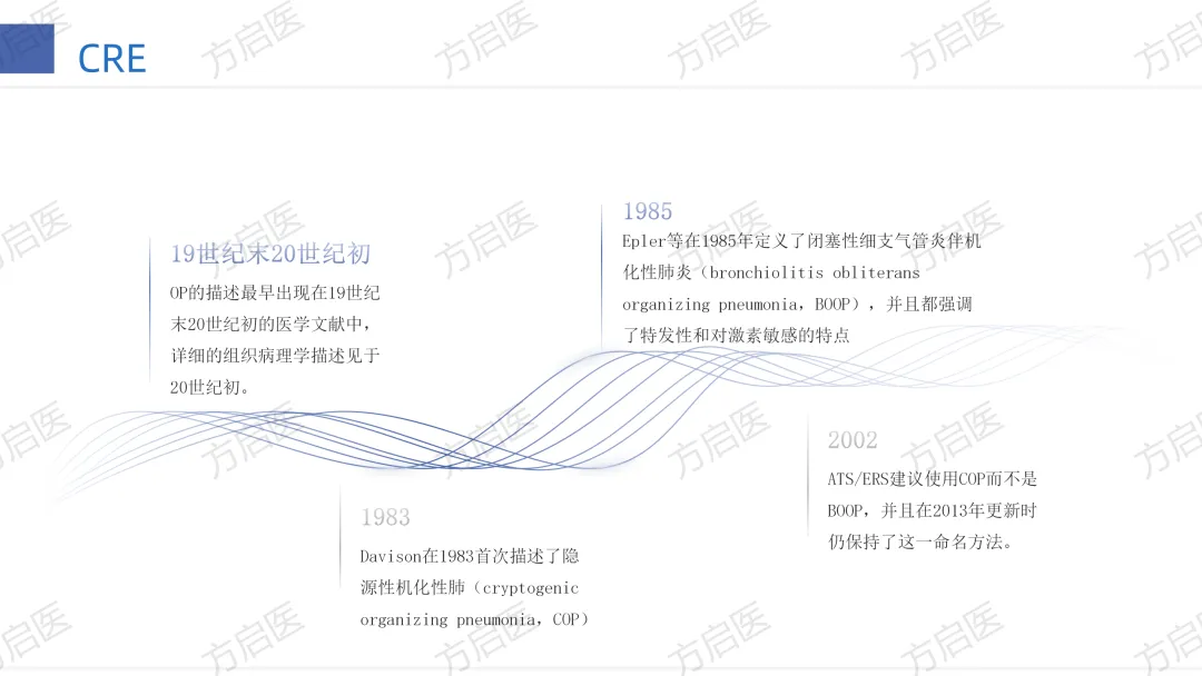 OP的描述最早出现在19世纪末20世纪初的医学文献中,详细的组织病理学描述见于20世纪初。作为一种临床疾病,Davison在1983首次描述了隐源性机化性肺炎(cryptogenic organizing pneumonia,COP)。随后Epler等在1985年定义了闭塞性细支气管炎伴机化性肺炎(bronchiolitis obliterans organizing pneumonia,BOOP),并且都强调了特发性和对激素敏感的特点。2002年,ATS/ERS建议使用COP而不是BOOP,并且在2013年更新时仍保持了这一命名方法。