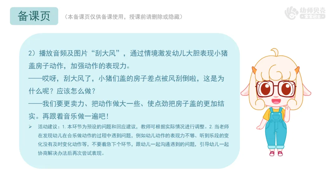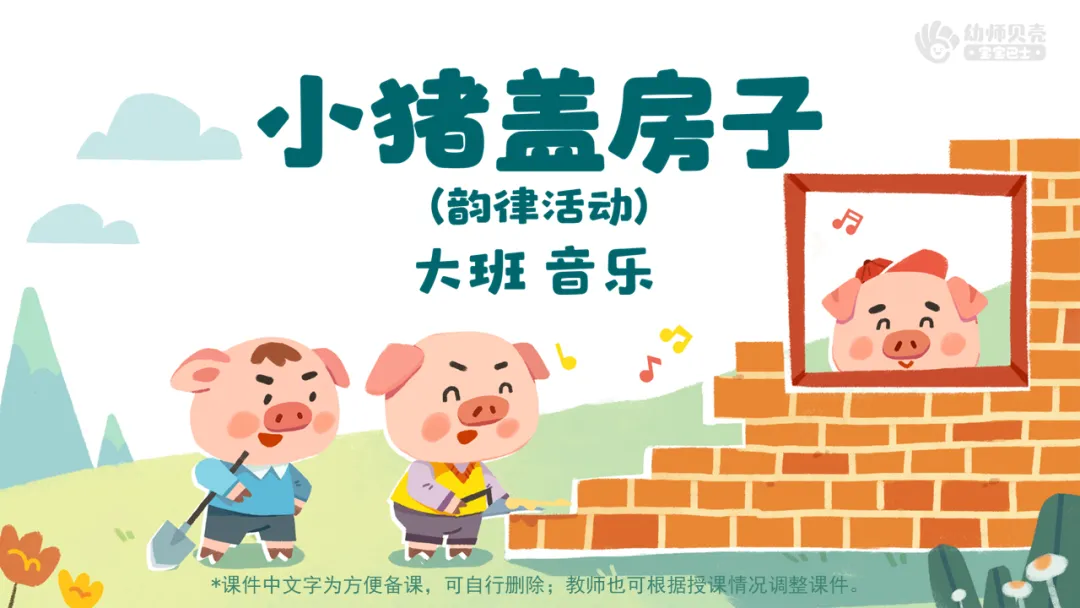 l重点:能跟随音乐的节奏大胆表现小猪盖房子时铲土、搬砖、砌砖块、垒高等动作。