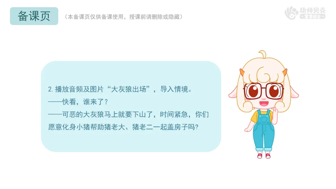 1.播放音频及图片“快下山的大灰狼”,通过情境激发幼儿继续盖房子。