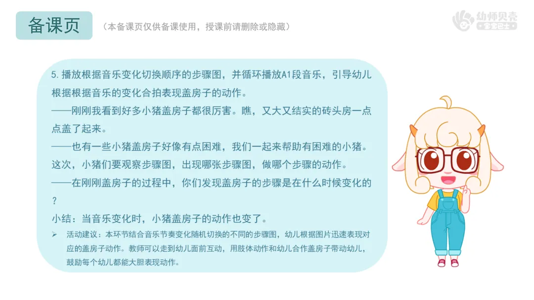 小结:当音乐变化时,小猪盖房子的动作也变了。