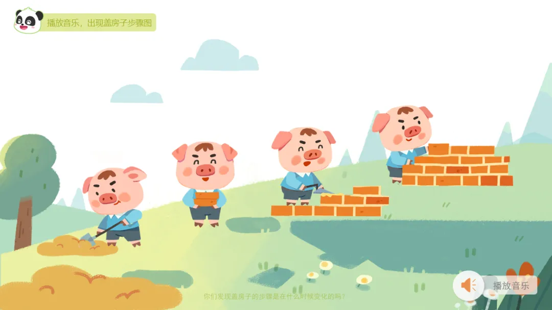 ——小猪的房子盖了一半啦,真的太厉害了!接下来会发生什么事情呢?继续听一听音乐吧。