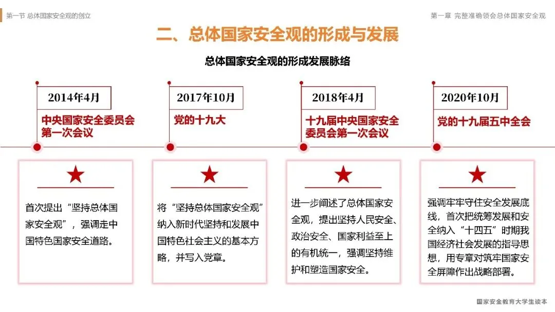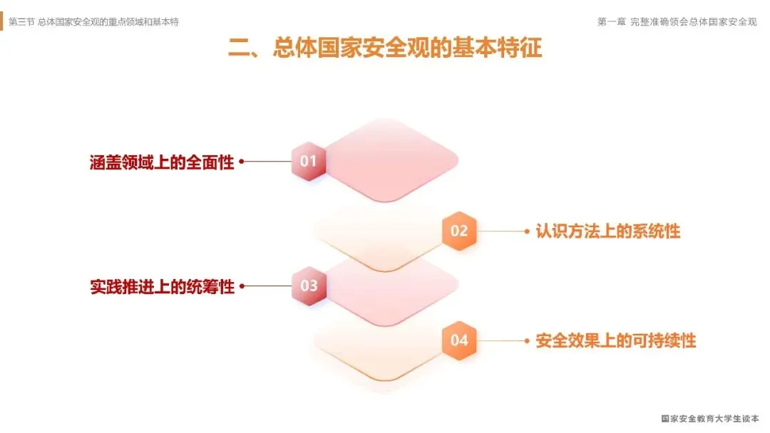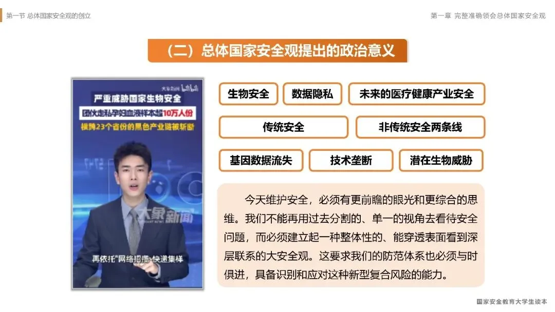[P4]以上案例清晰地表明,国家安全绝非抽象概念,它具体而微地体现在日常工作的每一个环节之中。一个小小的疏忽,就可能导致严重的后果。那么,如何从根本上系统性地认识、防范和应对各类安全风险呢?这就需要我们由具体的案例反思,上升到对科学理论的深刻把握。接下来,我们就从理论高度来系统学习我们国家新时代国家安全工作的根本遵循——总体国家安全观。
