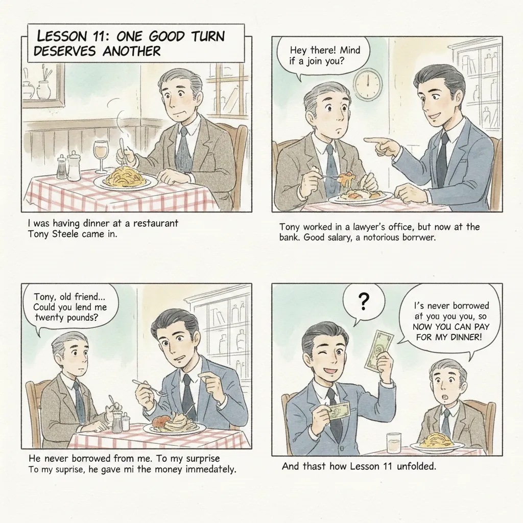 4. 标题的妙用:"One good turn deserves another"是一句英语谚语,通常意为"善有善报"或"礼尚往来"。课文用它作为标题,但故事结局却带有一种对这句谚语的戏谑性解读:托尼做了一件"好事"(借钱),但他立刻要求对方用另一件"好事"(付饭钱)来回报,将"善报"变成了即时、等价甚至带点算计的"交易",产生了幽默效果。这种对常见短语或谚语的创造性运用,值得学习。
