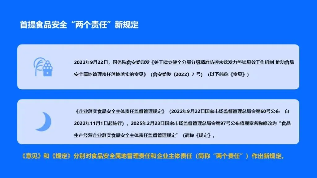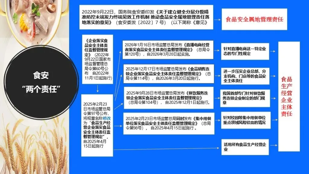 2022年9月22日,国务院食安委、市场监管总局分别印发《关于建立健全分层分级精准防控末端发力终端见效工作机制 推动食品安全属地管理责任落地落实的意见》(食安委发〔2022〕7 号)和《企业落实食品安全主体责任监督管理规定》(2022年9月22日国家市场监督管理总局令第60号公布,自2022年11月1日起施行),分别对食品安全属地管理责任和企业主体责任(以下简称“两个责任”)作出总局令第120号定,标志着落实食品安全“两个责任”工作机制的正式确立与全面部署。