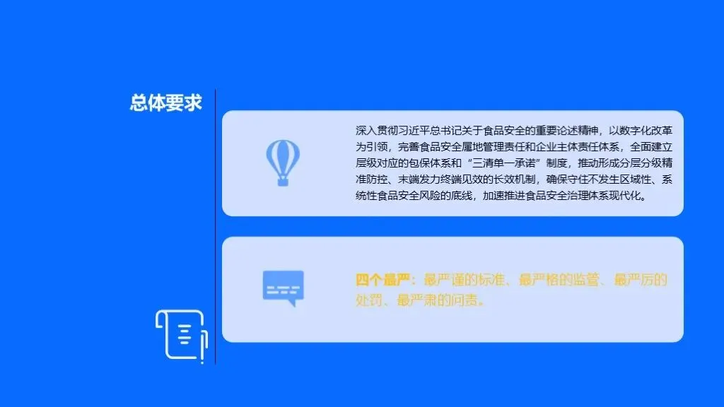 总体要求是深入贯彻习近平总书记关于食品安全的重要论述精神,以数字化改革为引领,完善食品安全属地管理责任和食品生产经营企业主体责任体系,全面建立层级对应的包保体系和“三清单一承诺”制度,推动形成分层分级精准防控、末端发力终端见效的长效机制,确保守住不发生区域性、系统性食品安全风险的底线,加速推进食品安全治理体系现代化。