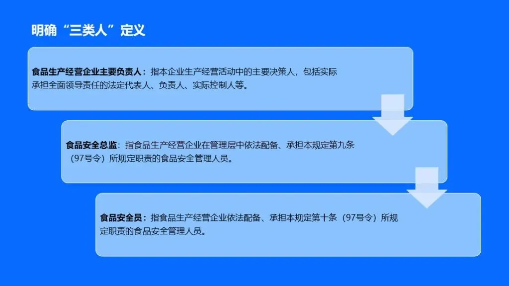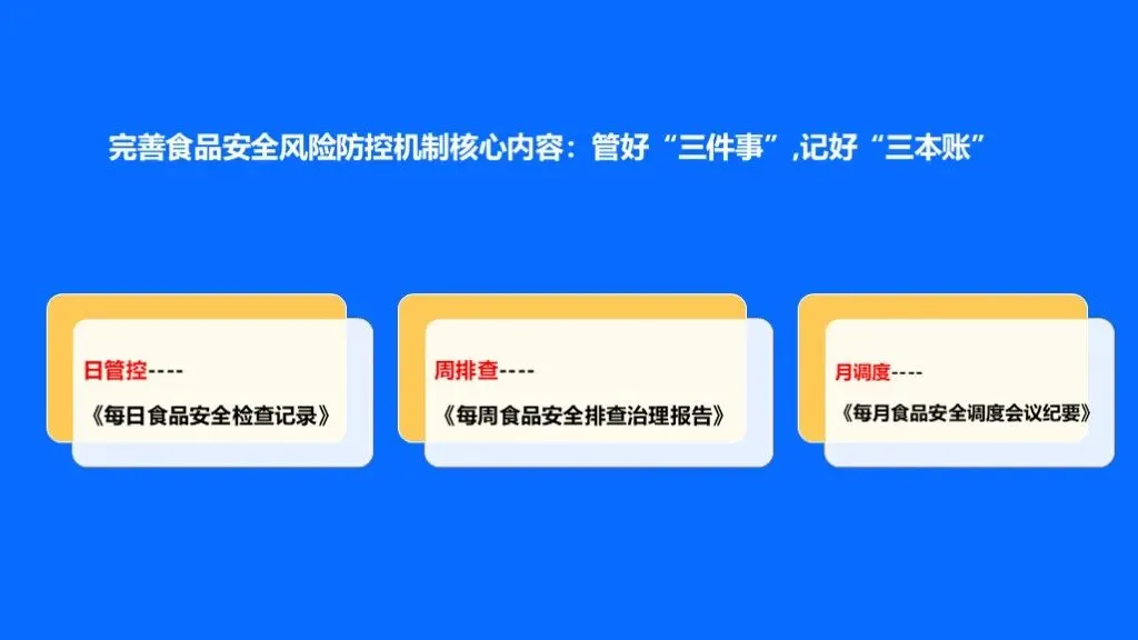 “两个责任”构建了“分层分级、精准防控、末端发力、终端见效”的属地管理责任落实机制,明确市、县、乡、村四级党政领导干部包保对应等级食品生产经营主体的责任体系。建立“三类人(企业负责人、食品安全总监、食品安全员)、三件事(日管控、周排查、月调度)、三本账(对应记录)”的企业主体责任基础落实框架,明确企业内部食品安全管理核心要求。