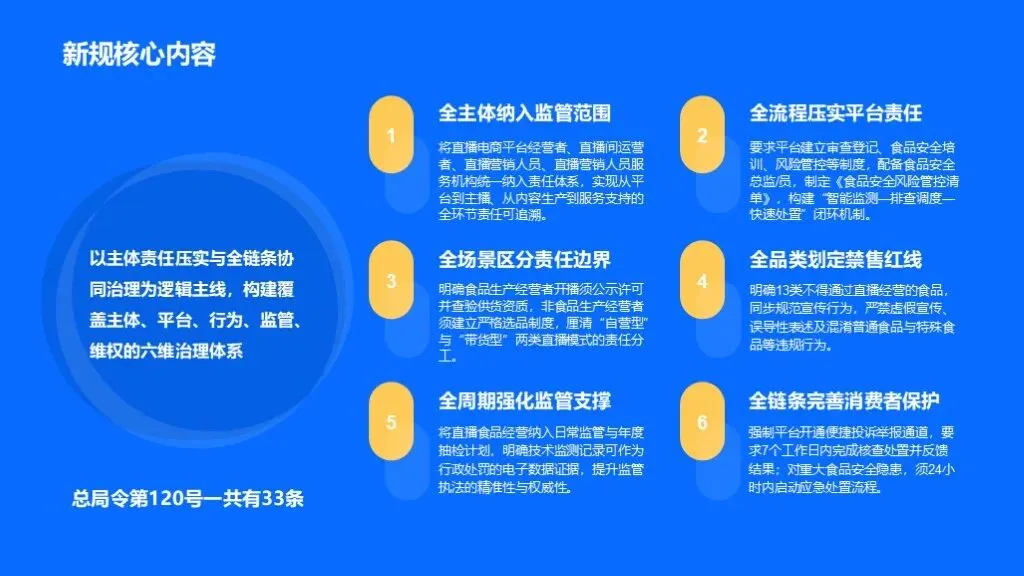 一是全主体纳入监管范围。总局令第120号将直播电商平台经营者、直播间运营者、直播营销人员、直播营销人员服务机构全部纳入了监管的范畴。从直播平台到直播间,再到主播和MCN机构,都必须按照这个总局令第120号的要求,履行相应的食品安全主体责任。一旦出了问题,该是谁的责任,谁就得负责,谁都别想逃避责任。