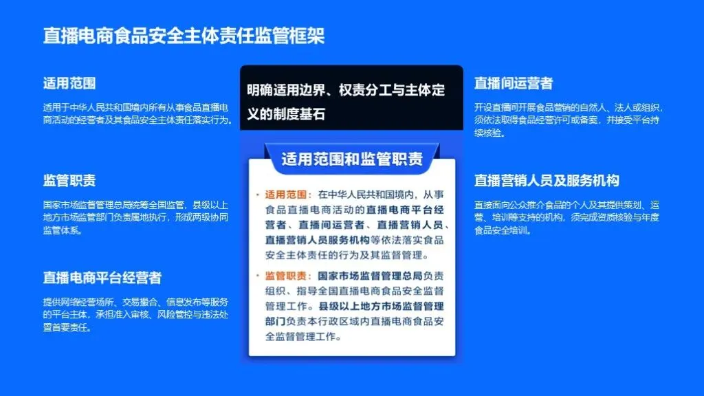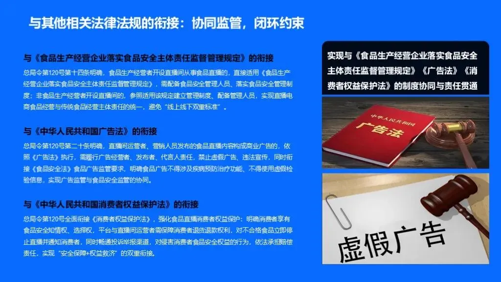 线上→线下 | 《食品安全规定》与传统食品经营主体责任规定衔接 | 责任对等,标准统一 | 店播直接适用线下食品经营标准,达播参照适用,避免“线上线下双重标准” |