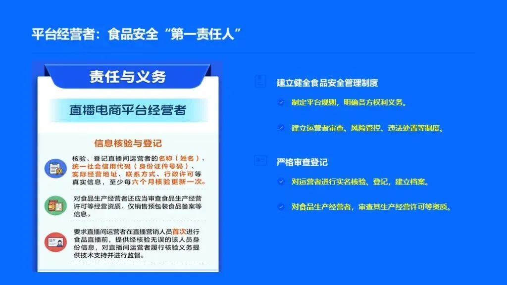 1. 建立健全食品安全管理制度 总局令第120号第五条 直播电商平台经营者应当制定平台服务协议和交易规则(简称平台规则),建立并实施直播间运营者审查登记、食品安全风险管控、食品安全违法行为处置等食品安全管理方面的制度,以及商业宣传、消费者权益保护等食品直播电商活动规范。 2. 严格审查登记 总局令第120号第六条 直播电商平台经营者应当要求申请进入平台从事食品直播电商活动的直播间运营者提供其名称(姓名)、统一社会信用代码(身份证件号码)、实际经营地址、联系方式、行政许可等真实信息,进行核验、登记,建立登记档案,并至少每六个月核验更新一次。 食品生产经营者开设直播间从事食品直播电商活动的,直播电商平台经营者还应当审查其依法取得的食品生产经营许可等经营资质、仅销售预包装食品备案等信息。 直播电商平台经营者应当要求直播间运营者在直播营销人员首次进行食品直播前,提供经核验无误的该人员身份信息,对直播间运营者履行核验义务提供技术支持并进行监督。 3. 建立健全食品安全培训机制 总局令第120号第七条直播电商平台经营者应当建立健全直播营销人员食品安全培训机制,每年对直播营销人员开展法律法规和食品安全知识的培训;在为首次进行食品直播的直播营销人员提供直播服务前,应当组织开展食品安全方面的培训。直播营销人员不得在接受培训时弄虚作假或者拒不参加培训。 直播电商平台经营者应当每年组织从事食品直播电商活动的直播间运营者、直播营销人员服务机构学习食品安全相关法律、法规、规章,及时通报市场监督管理部门的工作要求。 |