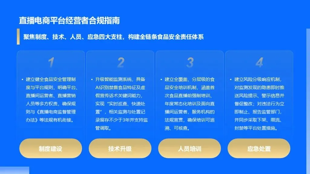 作为直播生态的“基础设施”与“规则制定者”,平台责任贯穿于主播管理、内容监控、风险处置、消费者权益保障及技术治理的全链条。平台要建章立制,并确保有效运行与闭环管理,尤其注意在采取处置措施时,必须同步保障消费者权益,重点落实:
