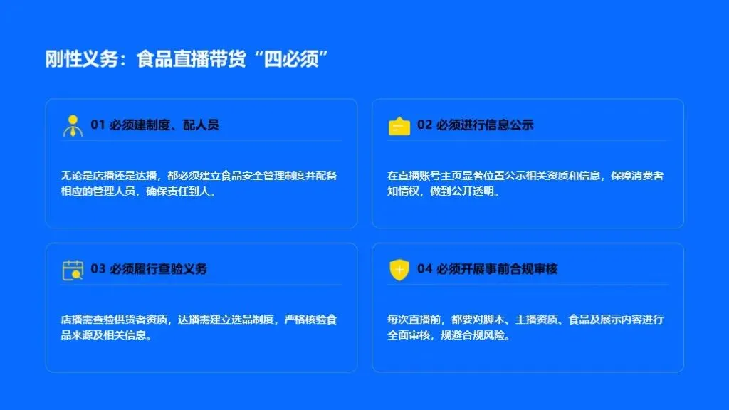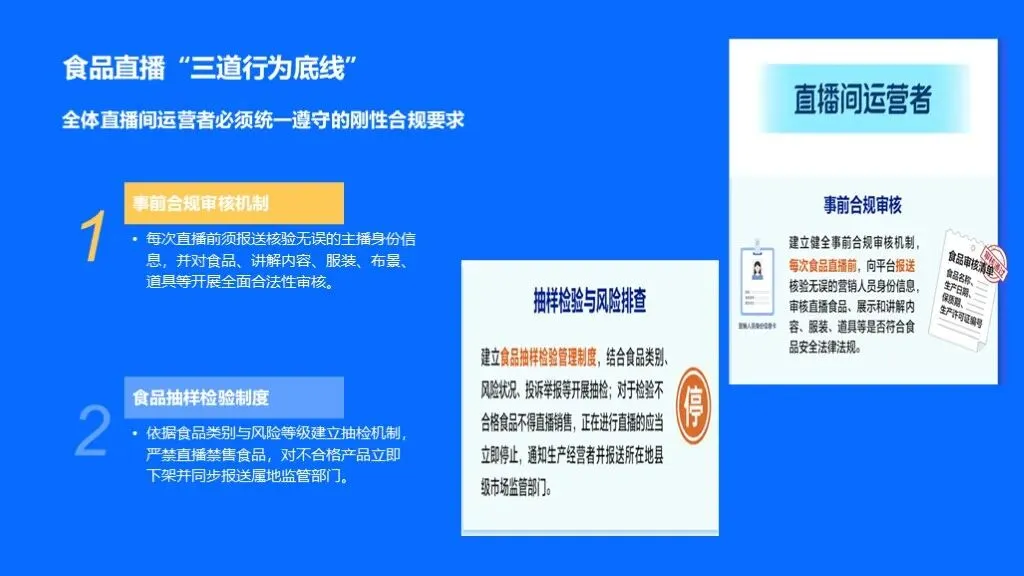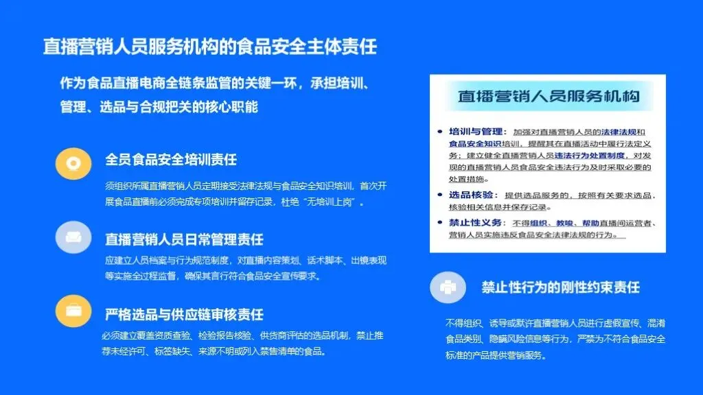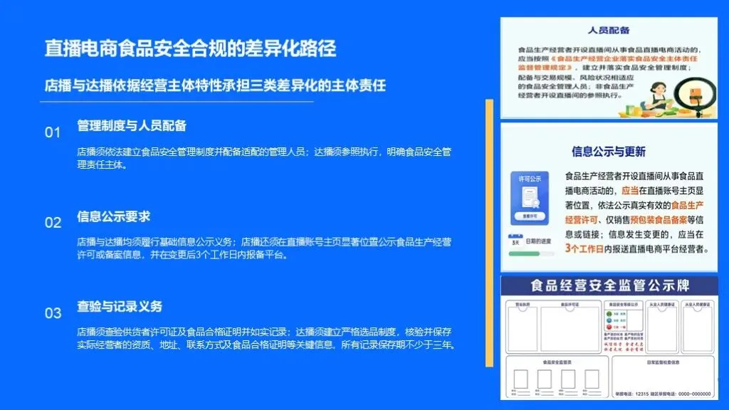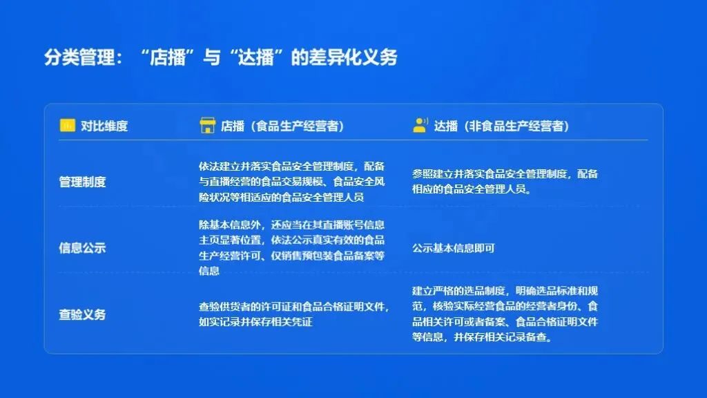 针对店播、达播的经营主体特性,总局令第120号设定了三类差异化的食品安全管理义务,是两类模式的核心合规要求: