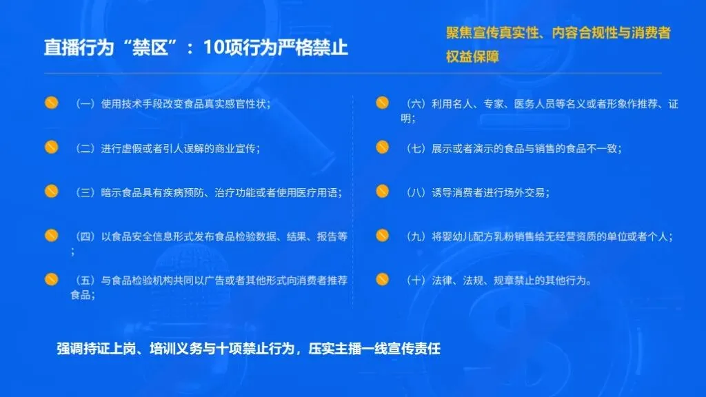 二是划定清晰监管红线,规范行业经营秩序。总局令第120号通过“禁售清单+行为禁令”的方式,为直播电商食品经营划定了明确红线。一方面,明确13类不得直播经营的食品,涵盖特殊医学用途配方食品、婴幼儿配方乳粉、过期食品、无资质自制食品等高风险品类,从源头上阻断问题食品流入直播间;另一方面,细化10项直播行为禁令,严禁使用技术手段篡改食品感官性状、虚假宣传食品功效、混淆食品与药品等违规行为,精准整治行业乱象。同时,总局令第120号明确了违规处罚标准,对拒不改正或情节严重的行为,可处1万元以上10万元以下罚款,情节特别严重的将吊销资质并移送司法机关,大幅提高了违法成本。这些举措将有效遏制违法违规行为,引导行业主体依法合规经营,推动直播电商食品行业从“野蛮生长”向“规范发展”转型。